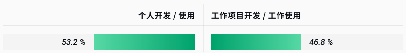 工作与非工作场景下开发/使用开源软件的情况大约各占一半,看得出来开源不仅是工作需要,也与开发者个人日常生活关系紧密。