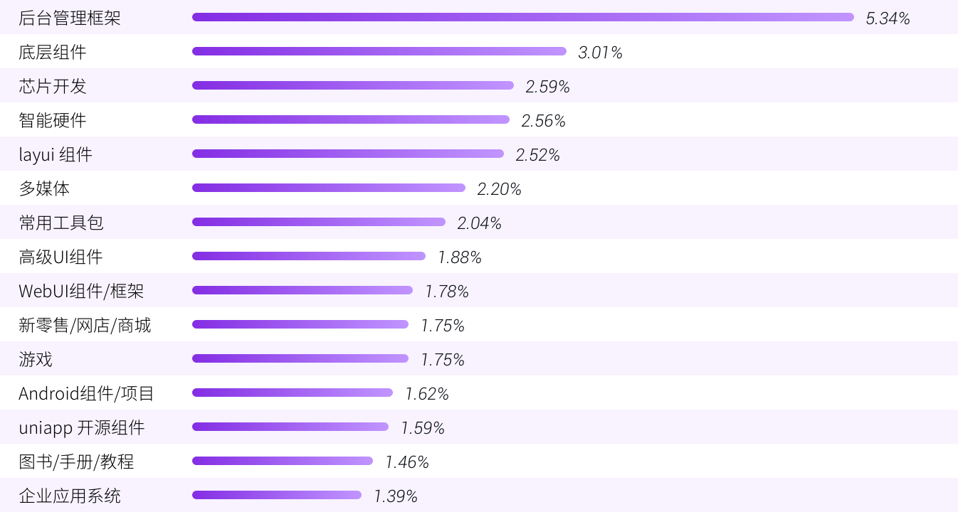 从 Gitee 上 2021 年用户 Star过的开源项目所在领域的分布来看,后台管理框架相关领域的开源项目依然最受开发者关注,占比超过了样本数的 5%,位居其后的是底层组件和芯片开发,占比分别为 3.01% 和 2.59%。