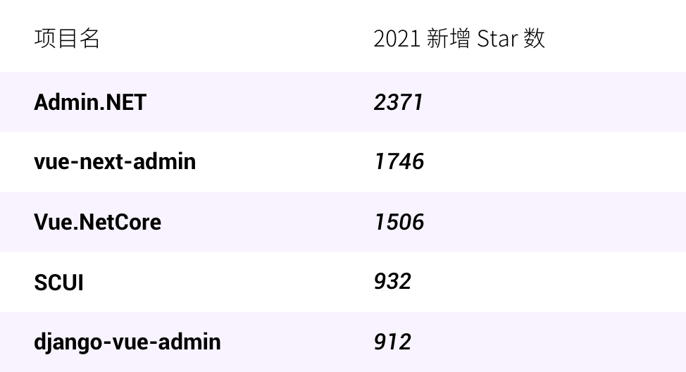 具体到项目上来看,以下五个项目是后台管理框架年度新增 Star 数量最多的项目,也意味着这些项目是在开发者群体中使用较多的项目。