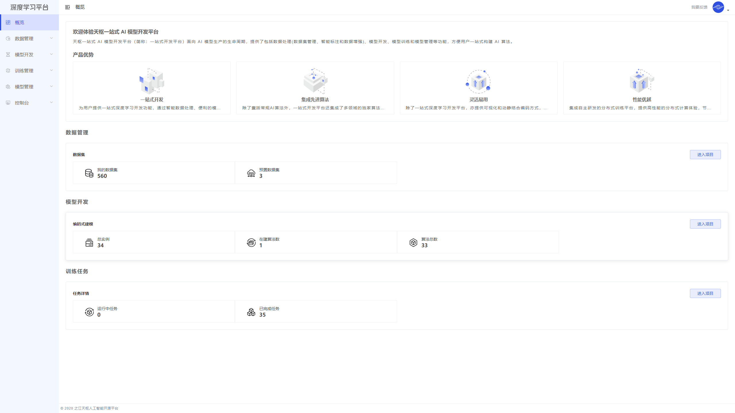 天枢人工智能开源开放平台(简称:天枢平台)是由之江实验室牵头,联合北京一流科技等共同打造的具有自主知识产权的人工智能开源平台。整个平台由一站式AI模型开发平台、高性能深度学习框架和模型炼知框架三大子系统组成。其中, 一站式AI模型开发平台(简称:一站式开发平台)面向AI模型生产的生命周期,提供了包括数据处理、模型开发、模型训练和模型管理等功能,方便用户一站式构建AI算法。