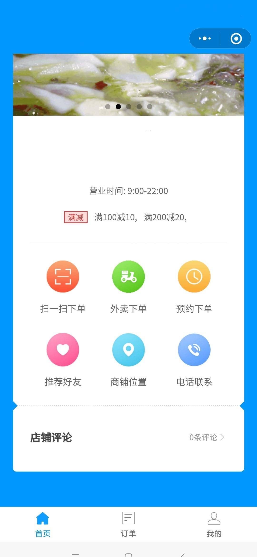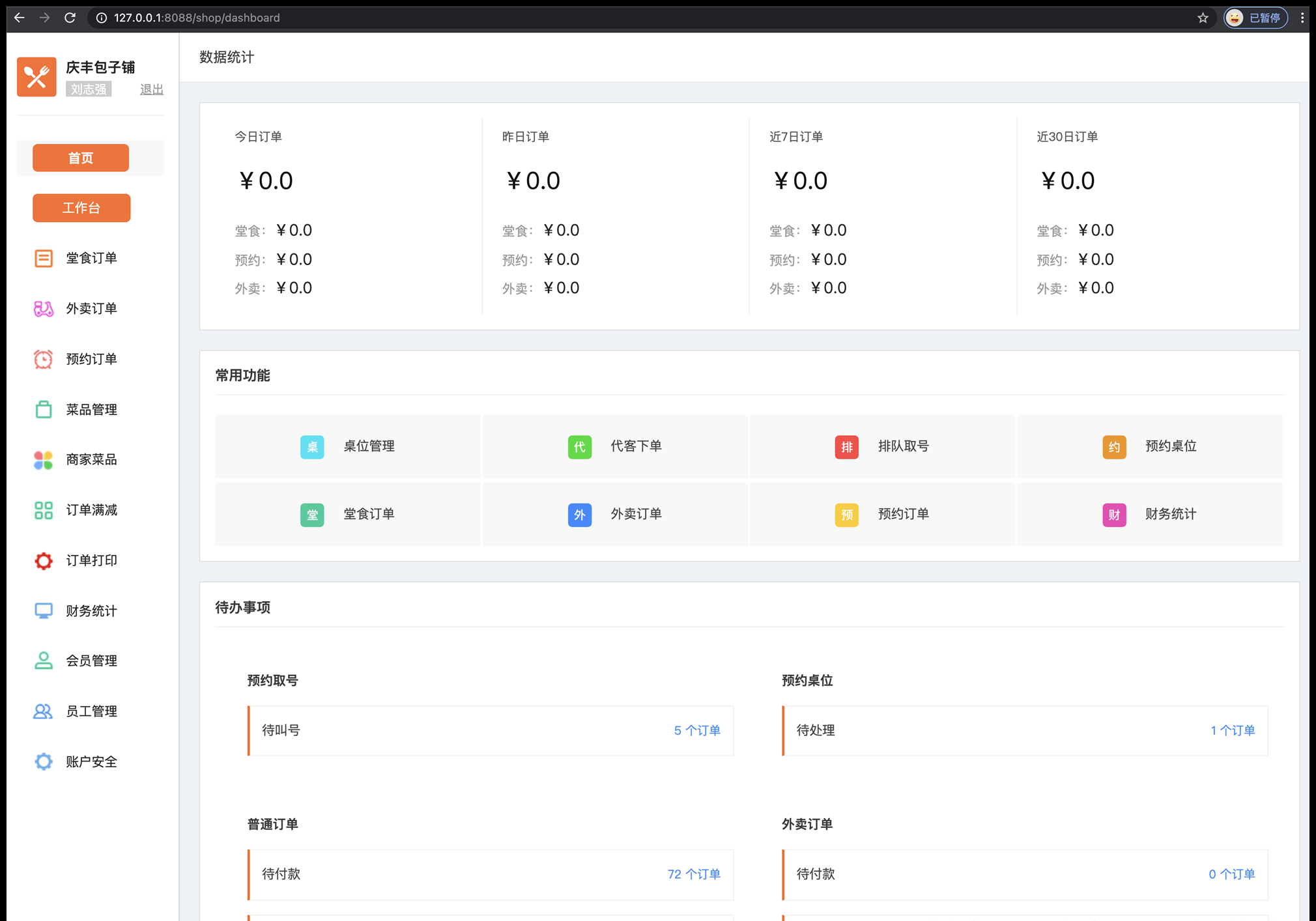 财务统计、堂食订单、外卖订单、预约订单、充值订单、排队取号、预约桌位、菜品管理、门店管理、订单满减、管理中心、会员管理、员工管理、授权发布、账户安全。