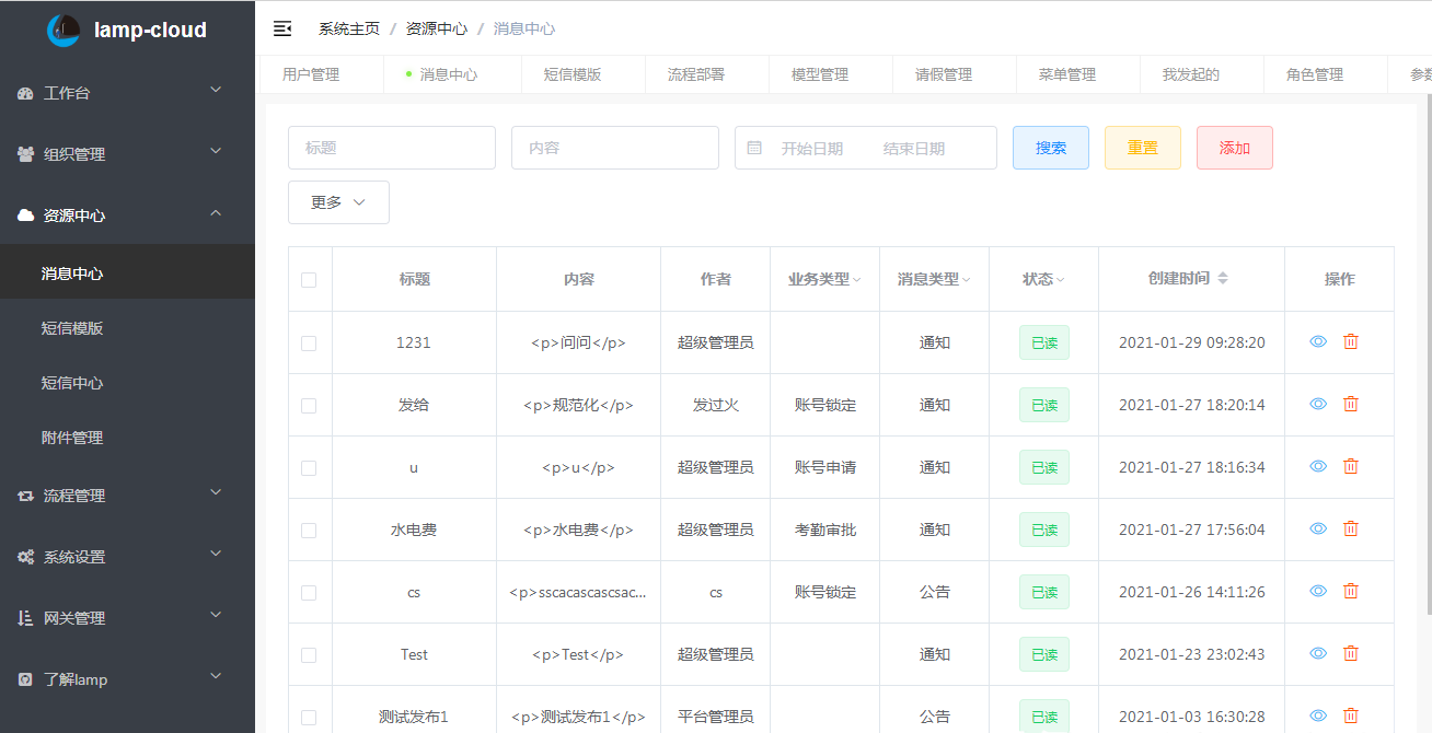 资源中心:消息、短信、附件管理