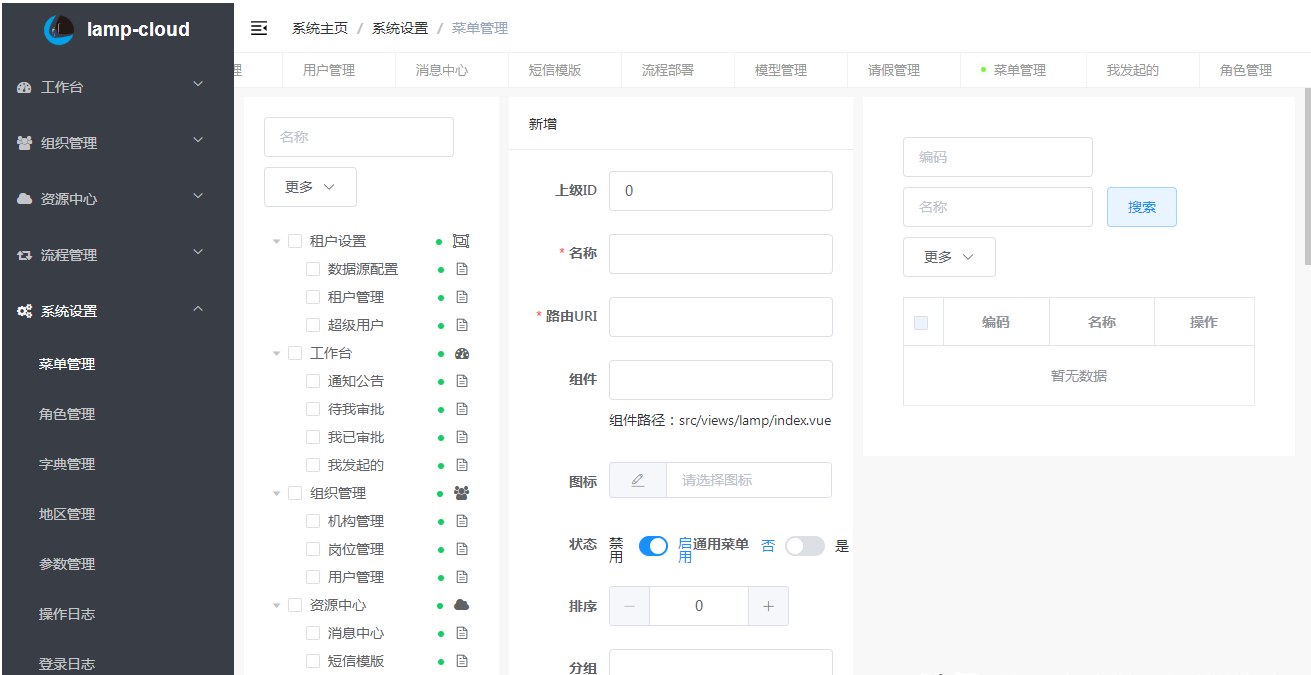 系统设置:菜单、资源配置、角色管理、给角色绑定用户、给角色授权菜单和资源、字典、地区、系统参数、操作日志、登录日志、应用管理等