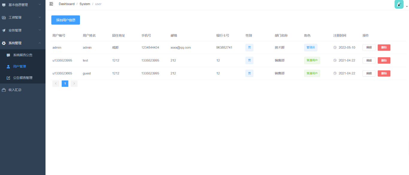 公司财务管理系统,包含用户基本信息管理(员工管理,管理员管理),工资管理(员工工资管理,管理员工资管理),业务管理(员工业务管理,管理员业务管理),系统管理(系统留言公告,用户管理,公告留言管理),收入汇总五个模块。