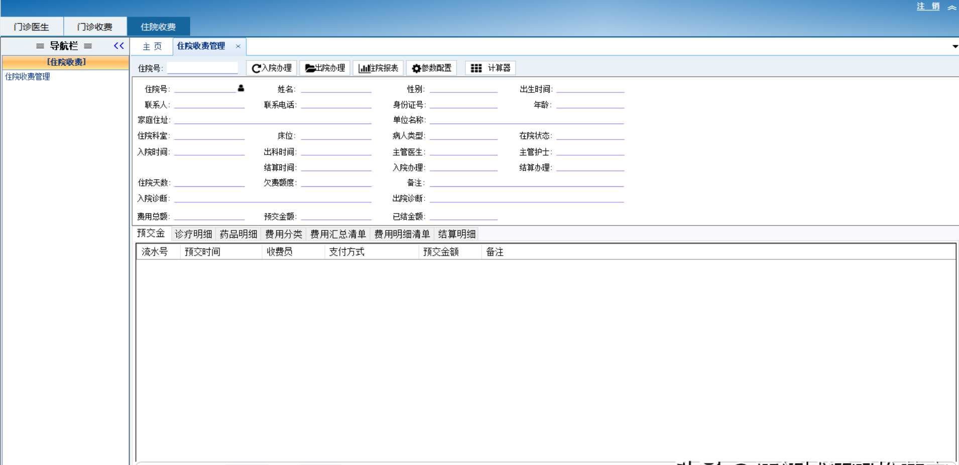 3.住院收费:住院收费管理 住院号 入院时间 住院科室 床位 入院诊断 预交金额
