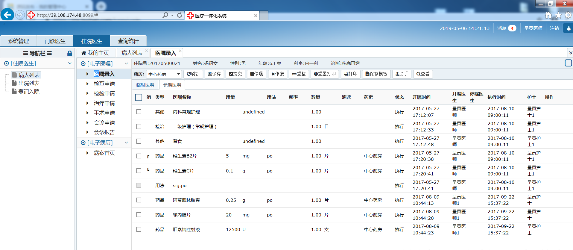 5.住院医生:病人列表 出院列表 登记入院 医嘱录入 检查申请 检验申请 治疗申请 手术申请