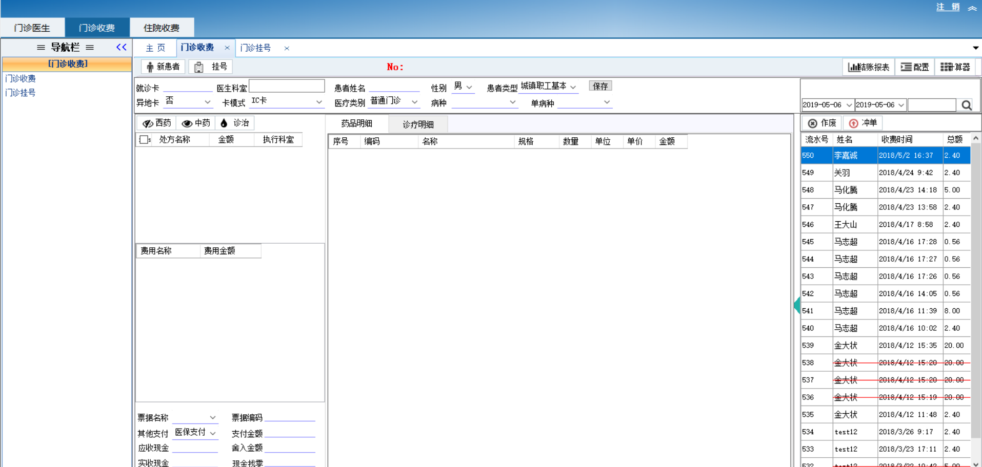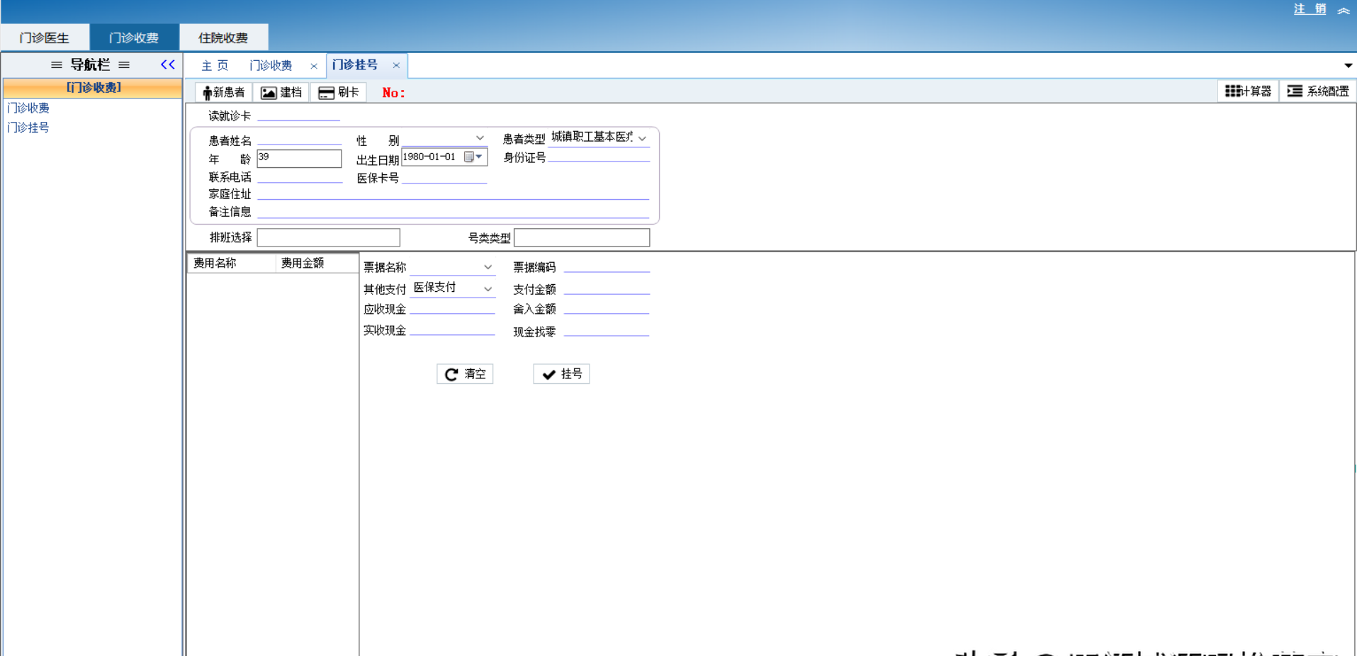 3.门诊收费:门诊挂号-新患者-建档-刷卡-读就诊卡
