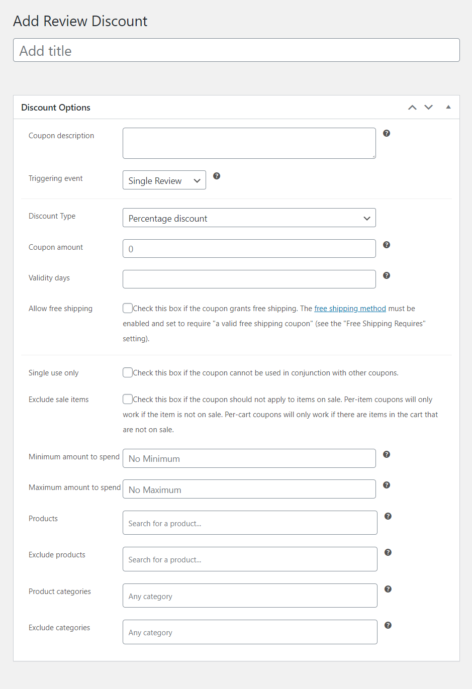 优惠券金额:WooCommerce 评论折扣插件允许您为此优惠券设置固定价值或折扣百分比。