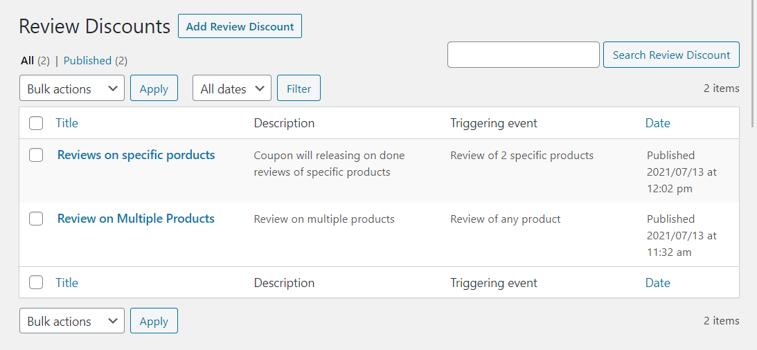 WooCommerce Review for Discounts 插件提供了两种类型的触发事件,如下所示: