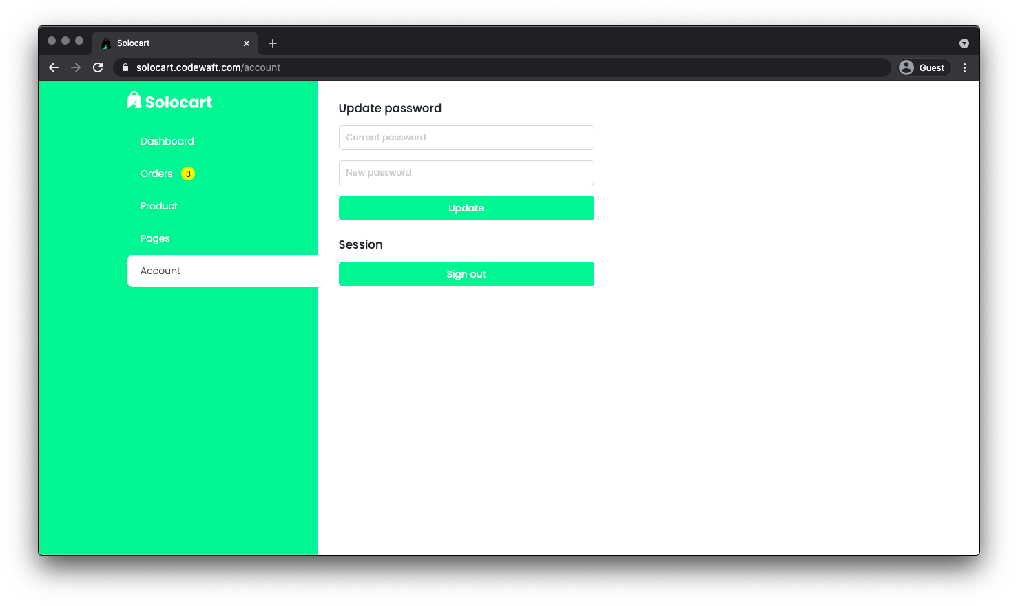 Solocart 包括一个管理面板,用于管理产品、变体、订单以及带有计数器和折线图的交互式销售报告。