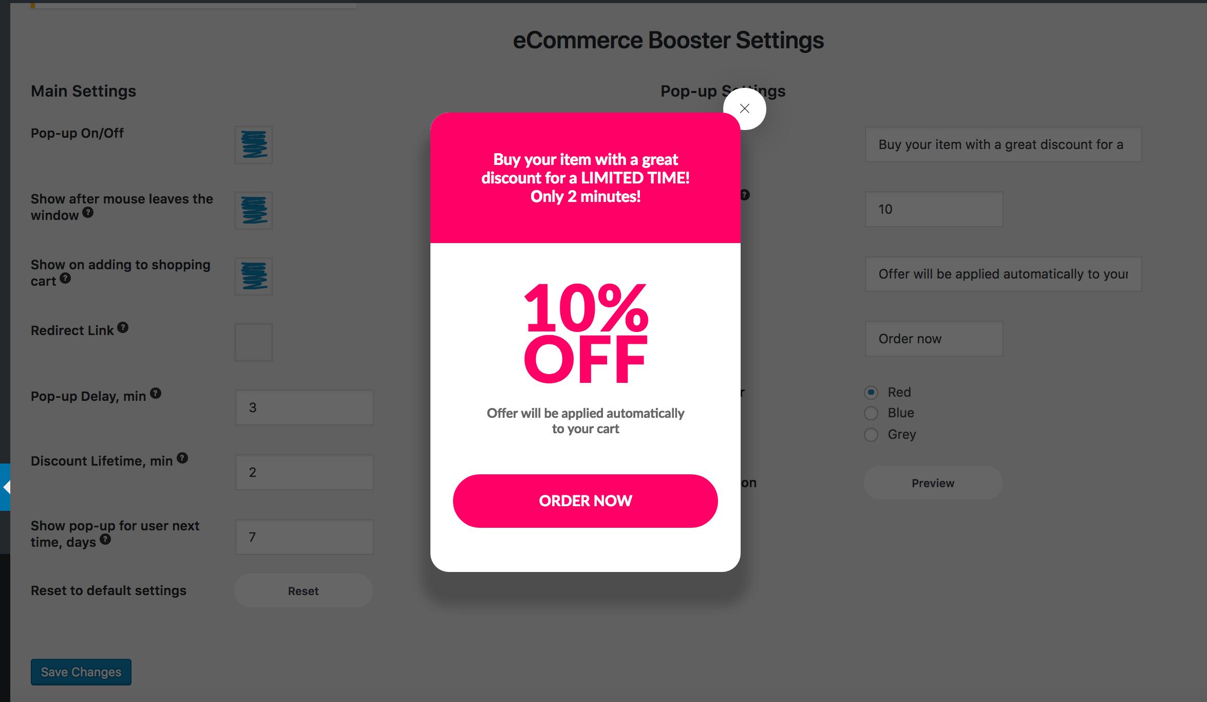 您可以选择延迟时间、确切的折扣金额以及弹出窗口的颜色和文本来吸引用户的注意力。