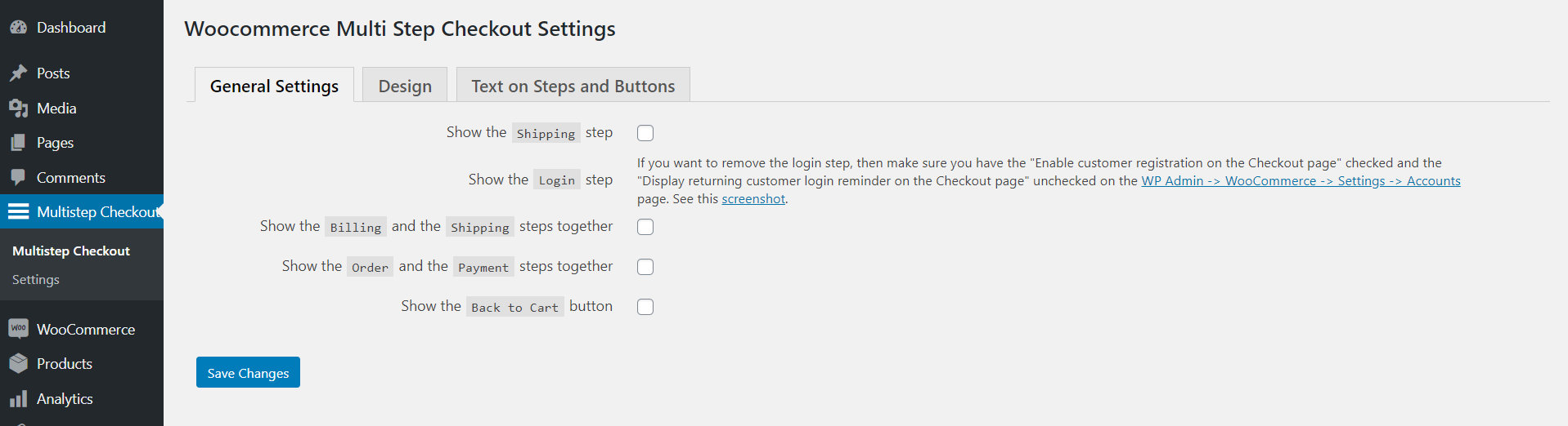 多步结帐具有三个不同的设置选项卡。一个用于常规设置,第二个用于设计设置(颜色),第三个用于文本和标签。