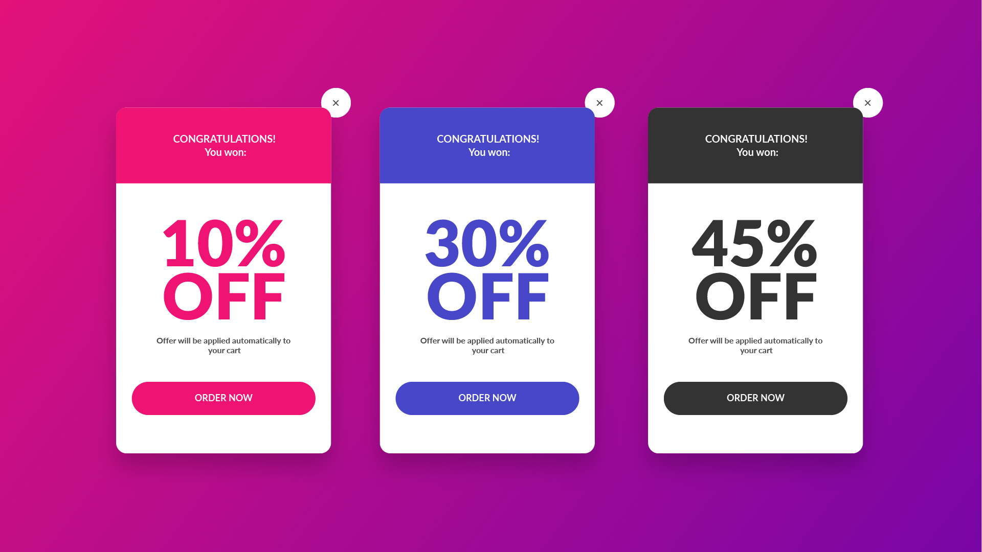 它易于使用,并可通过管理面板进行自定义。您在设置中指定的折扣金额将是用户的最大折扣 – 用户在获得最高分 (15) 并赢得游戏时收到的金额。对于得分较低的用户,折扣将按比例减少。