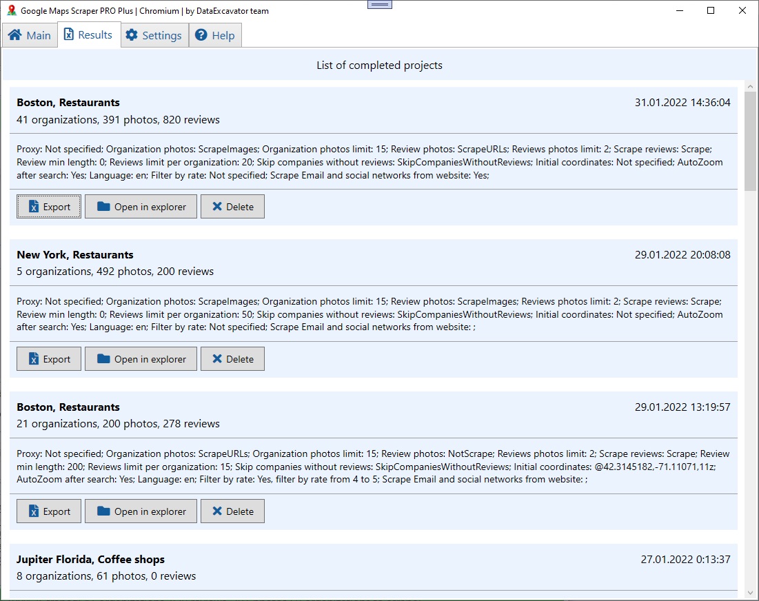 应用程序提取电话、地址、工作时间、组织描述、网站地址和其他信息。从每个组织的网站(如果列出),我们的抓取工具会提取电子邮件、facebook、twitter、youtube、yelp、tripadvisor 和其他社交媒体地址。应用程序还会抓取评论文本和组织的照片。所有照片都以 .jpg 文件格式保存到您的硬盘中。