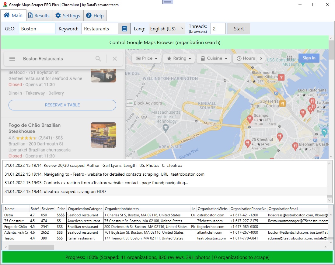 谷歌地图的专业数据抓取工具。该应用程序从地图本身和组织的网站中提取最大的有用信息。抓取是直接从谷歌地图网站完成的。您无需连接到 Google API。我们的刮板也有无限量的数据可供提取。只需下载程序,输入地理位置和关键字进行搜索。然后点击“开始”。应用程序将自行完成其余的工作。