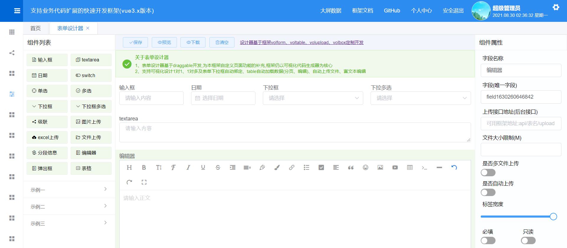 框架内置了大量的通用组件可直接使用,并内置了基于本框架定制开发的代码生成器,尽量避免重复性代码编写。支持前端、后台自定义业务代码扩展,后台提供了大量常用扩展与通用类;前端、后台提供了近300个扩展方法与属性,开发人员可在此功能上编写扩展自定义业务代码