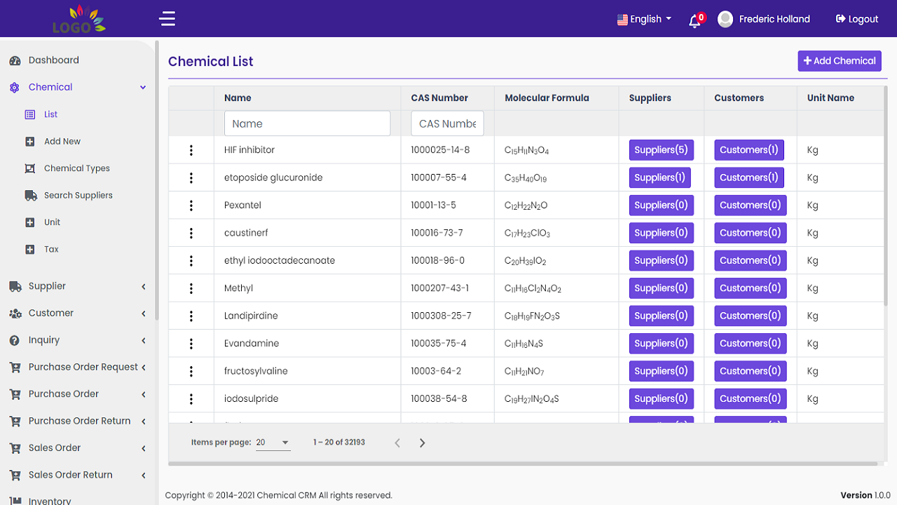 管理您的所有化学品、供应商、客户及其化学品、查询、供应商采购订单、客户销售订单、库存和所有业务文件。有强大的过滤功能,您可以搜索每个化学品供应商和客户,或按化学品搜索供应商和客户。