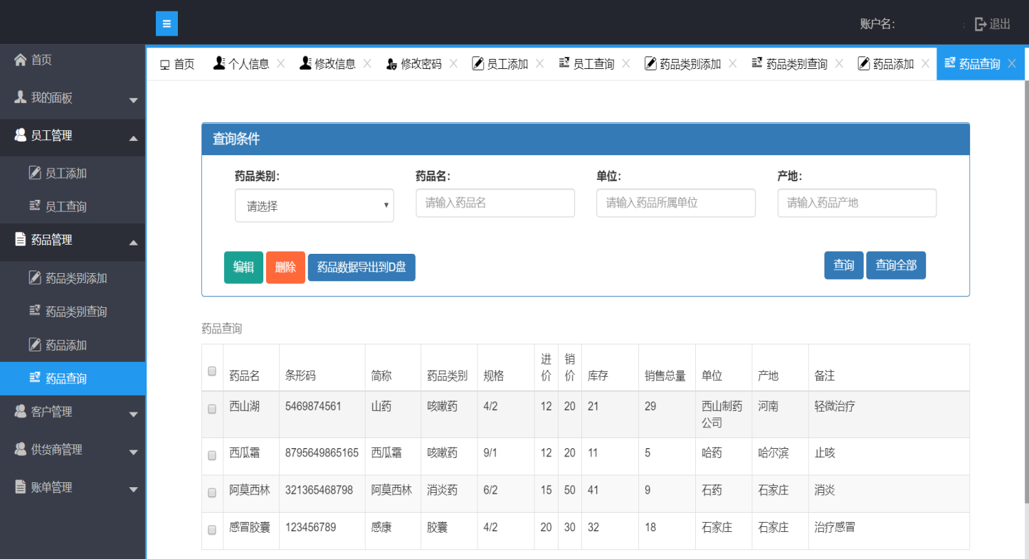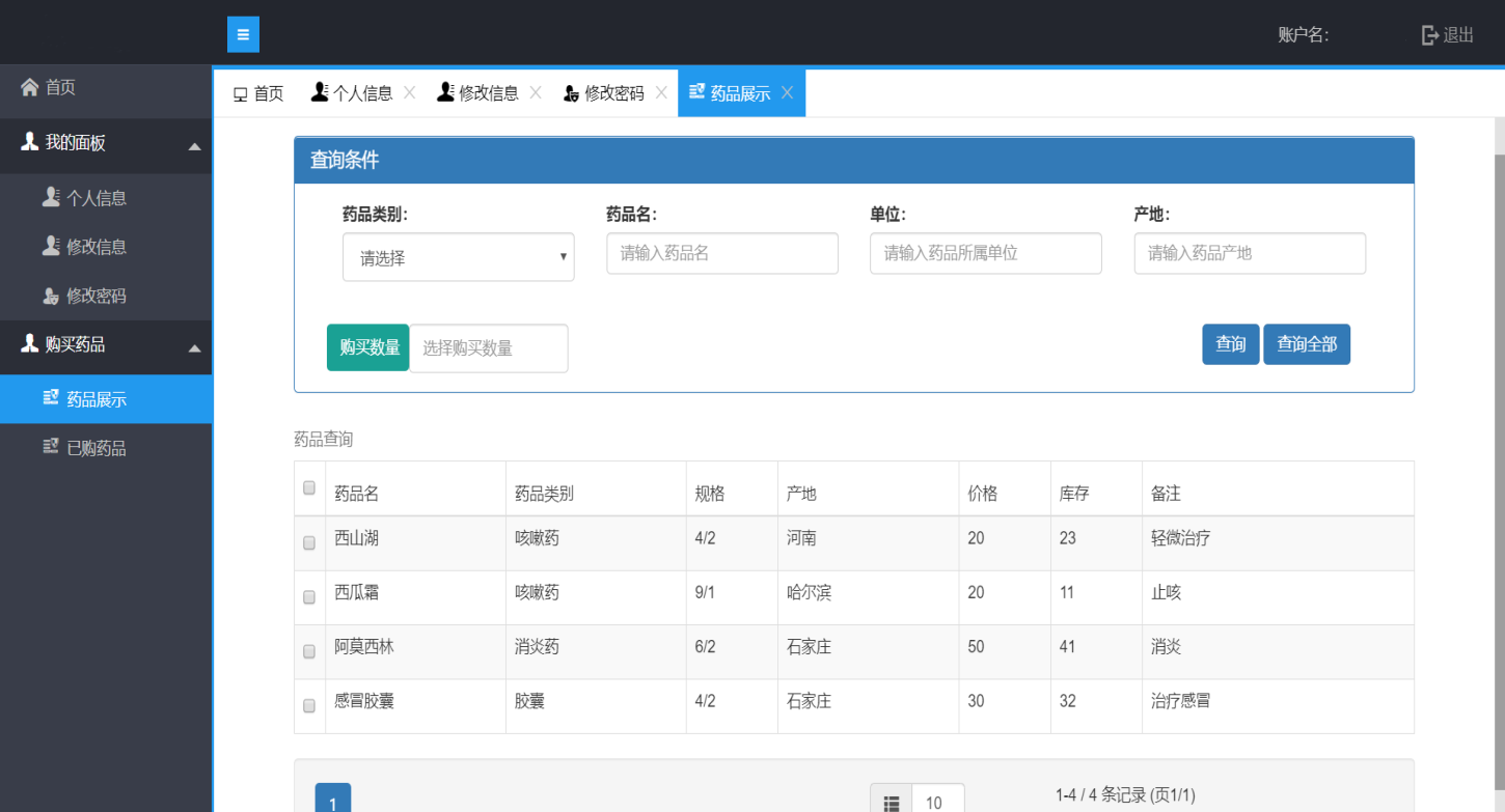 个人信息 修改信息 修改密码 购买药品 已购药品 药品展示 药品类别 药品名 产地