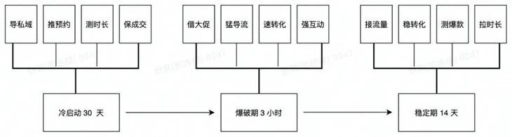 结合了商家实际案例,总结出一套方法,将视频号直播间起量分为 3 个阶段:冷启动期(30 天)、爆破期(3 小时)、稳定期(14 天)。