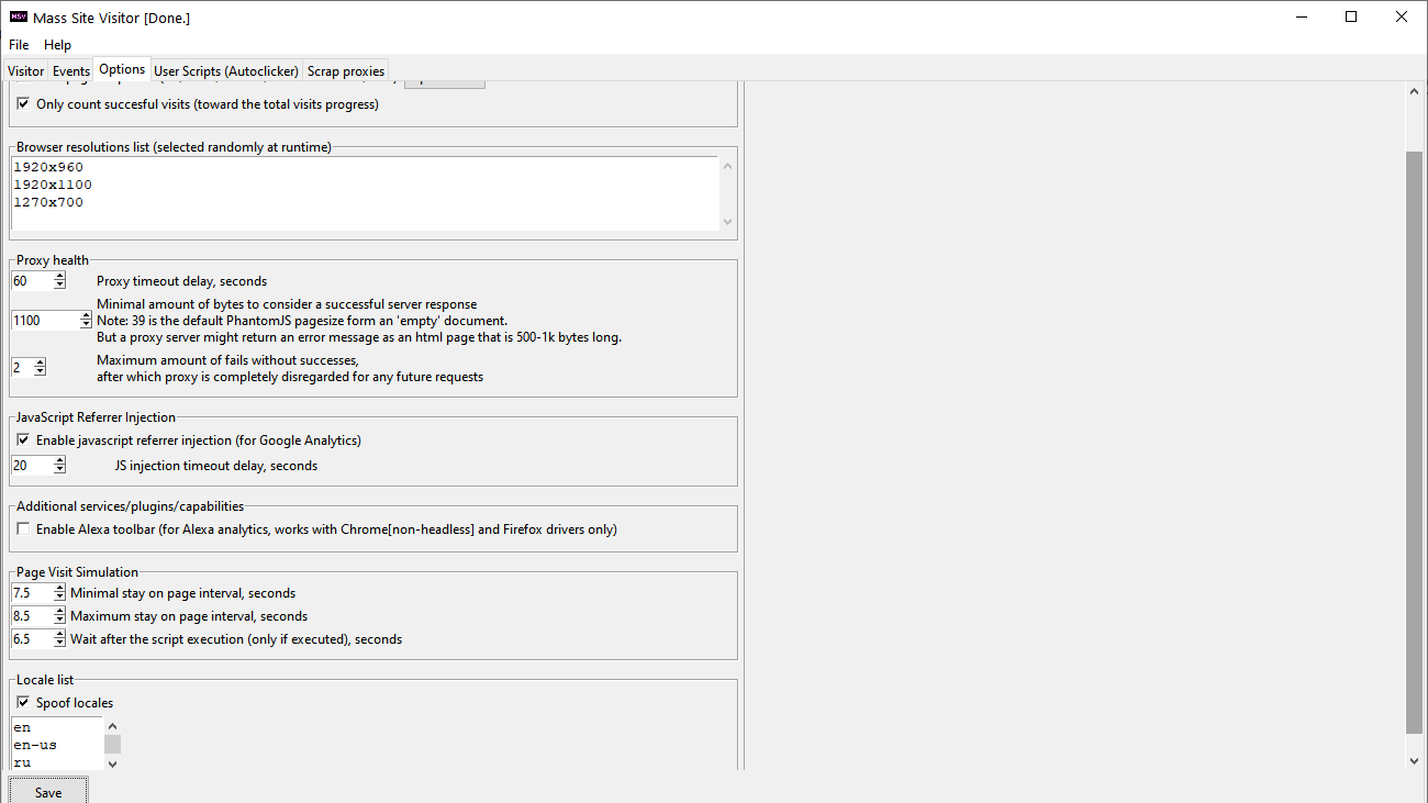 您可以设置引荐来源网址和用户代理,它们将与代理一起随机选择以创建浏览器会话。推荐人、用户代理和代理应存储在文本文件中,并且可以通过按“加载列表”按钮附加到程序中已加载的列表中。请记住在公共 socks4/5 代理的 IP 之后添加单词 socks5,以空格分隔。此浏览器会话的结果,您可以选择保存为每次访问的图像快照(以查看如何从不同 IP 看到网站),使用浏览器在页面上时的自定义行为,您可以将机器人设置为单击也有一些链接(查看设置 – 选项窗口)。可以从有效的代理中过滤掉无响应的代理,并将它们保存到文件中(设置 – 导出健康代理)。如果您没有自己的代理列表,并且 MSV 提供的代理列表不令人满意(随着时间的推移,这些代理可能会停止工作),则可以从网络上删除公共代理,设置 – 导入代理从网络上,如果你从网络上抓取代理,你不必担心为 socks 代理添加代理类型,程序会以正确的格式保存所有信息。在程序上下文中发生的事件日志可供用户研究。它将包含有关代理抓取过程的消息,以及通过代理向目标网站发送流量的过程。