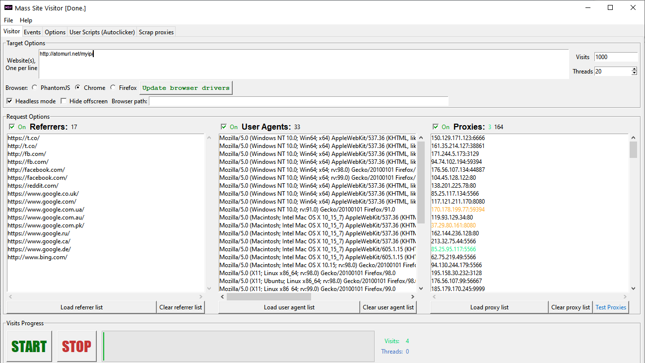 Mass Site Visitor (MSV) 旨在通过代理列表以多线程方式为您选择的网站生成大量流量。它在您的 PC 上在后台运行自动浏览器会话,并通过代理引导他们的流量。 MSV 允许您设置访问者行为,从简单的类似页面访问到复杂的有条件点击网页的任何元素。