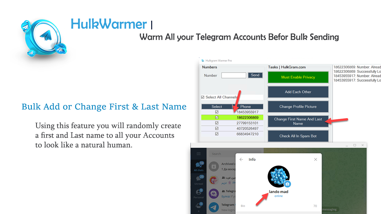 批量添加或更改名字和姓氏:使用此功能,您将为所有帐户随机创建名字和姓氏,看起来像一个自然人。