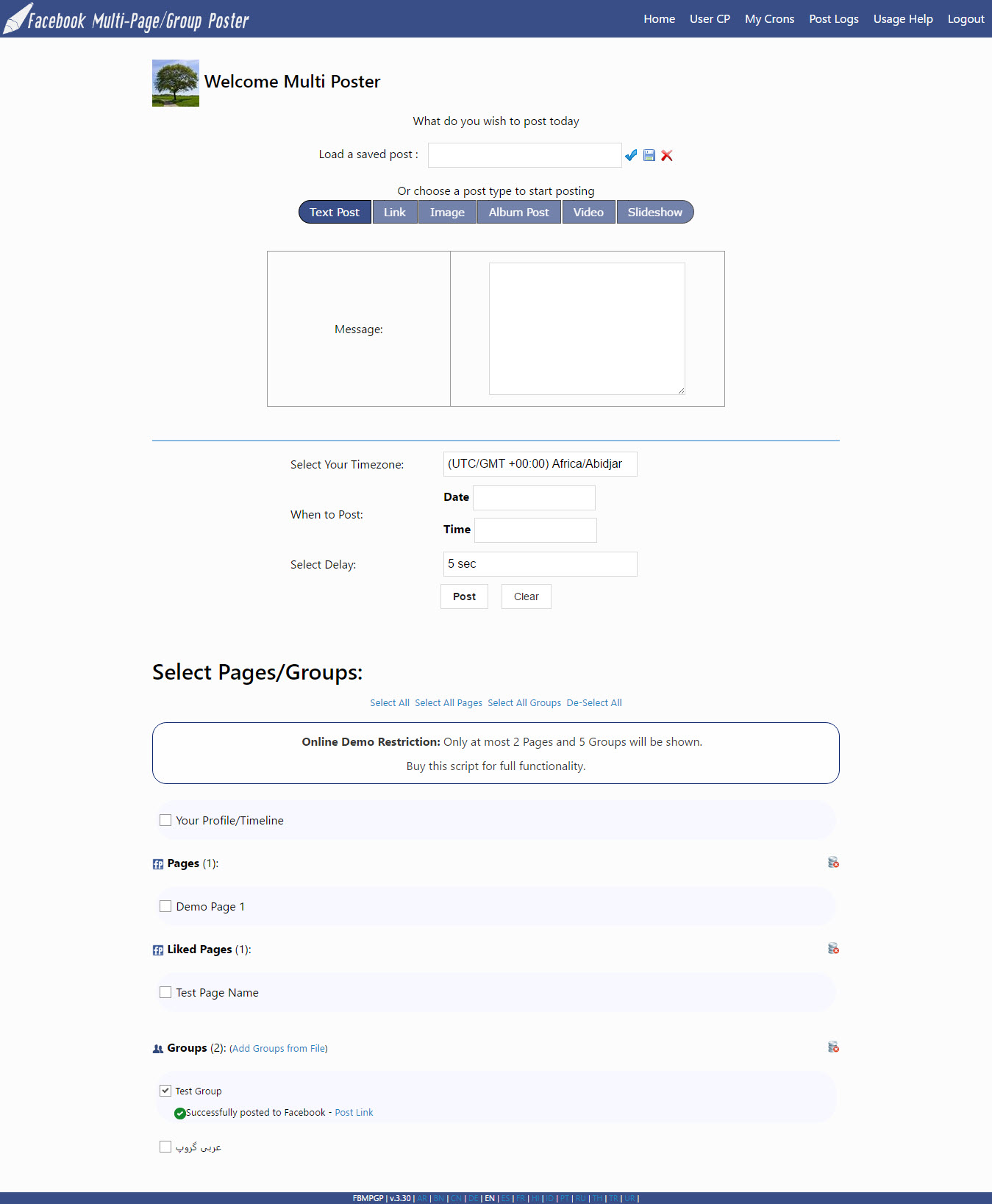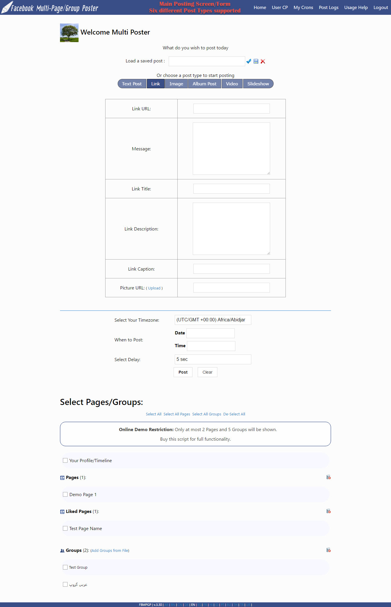 Facebook 多页面/群组海报允许您一次性将六种不同类型的内容发布到多个 Facebook 页面、Facebook 粉丝页面和 Facebook 群组。
