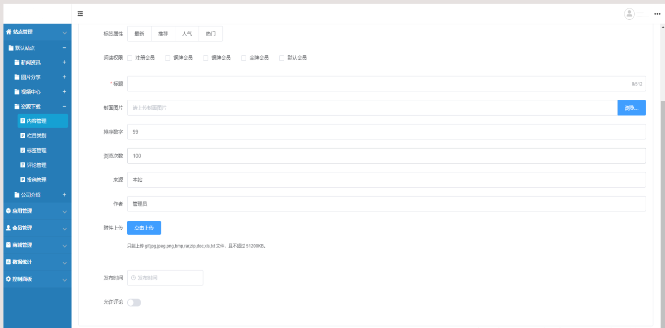 系统内置模块有资讯、商品、视频、图片、下载五大功能,支持会员、微信,用户可以在后台创建自已需要的频道功能,
