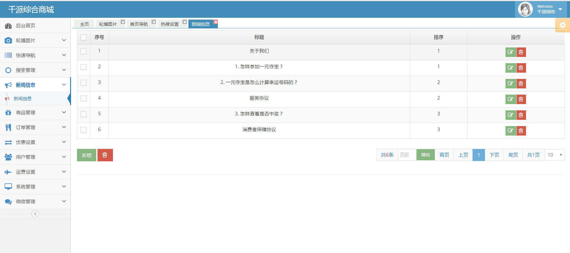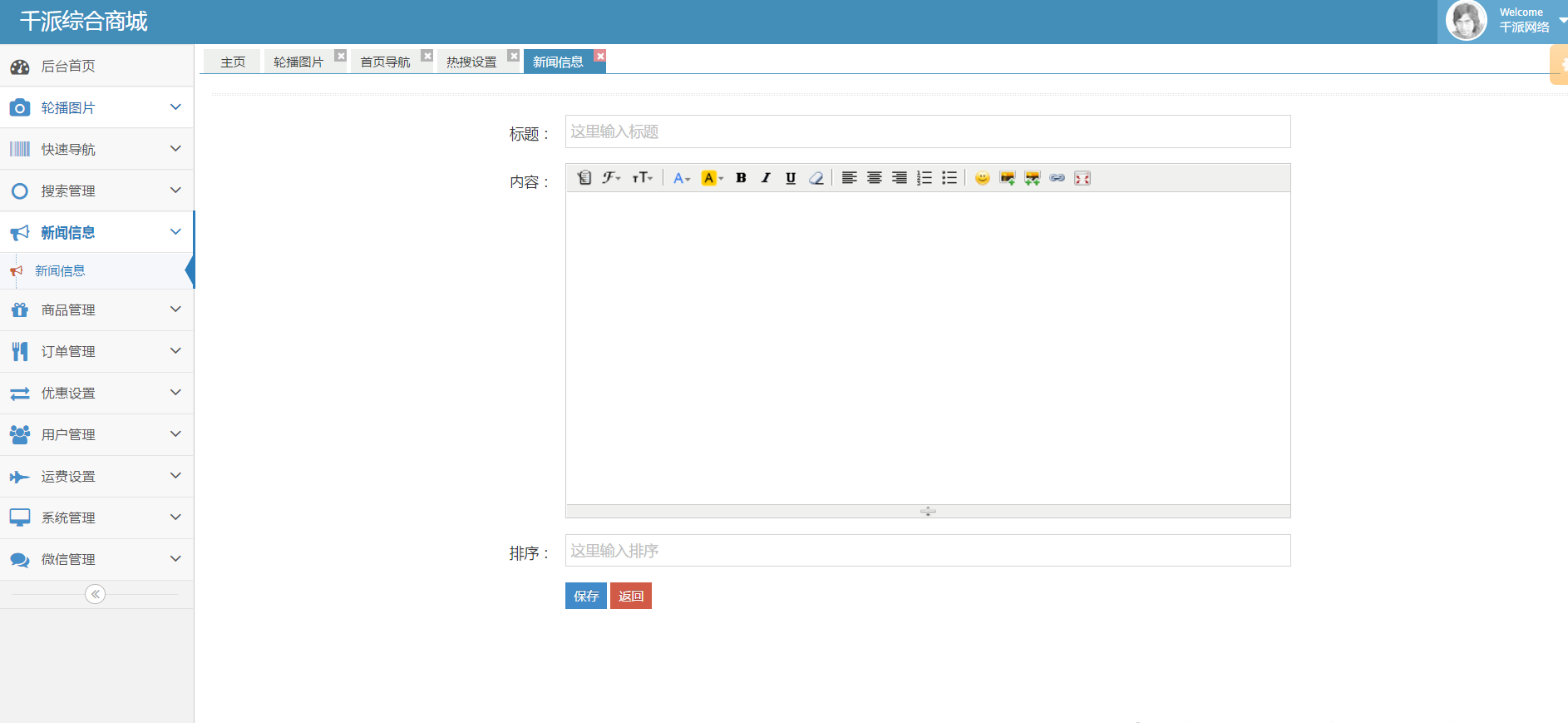 商城首页的新闻通知,可以展示一些促销及商城的一些信息;包含标题,富文本内容及排序功能