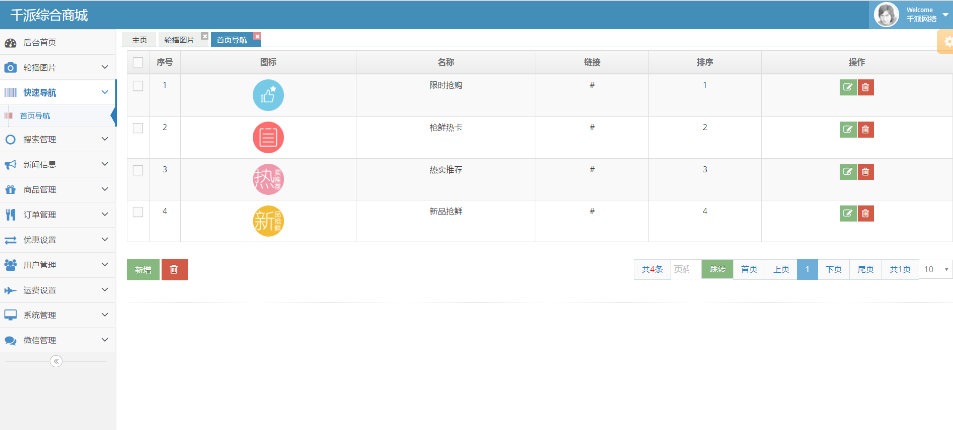用于商城首页的活动、引导等的导航图标;包含图片上传,自定义链接及排序功能