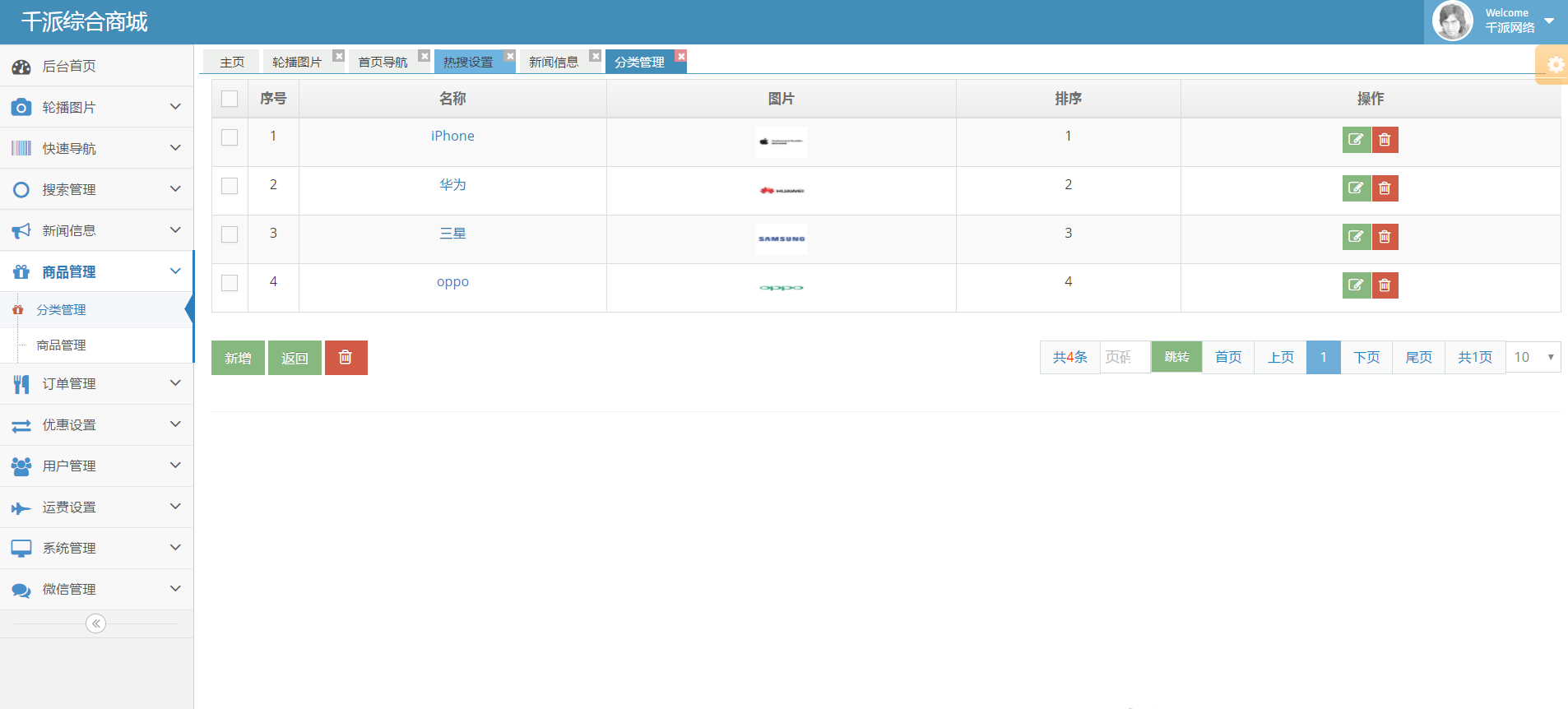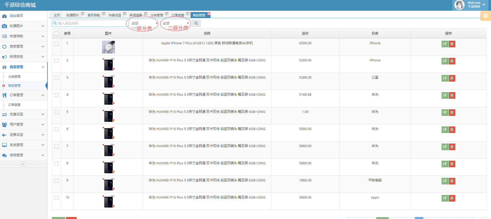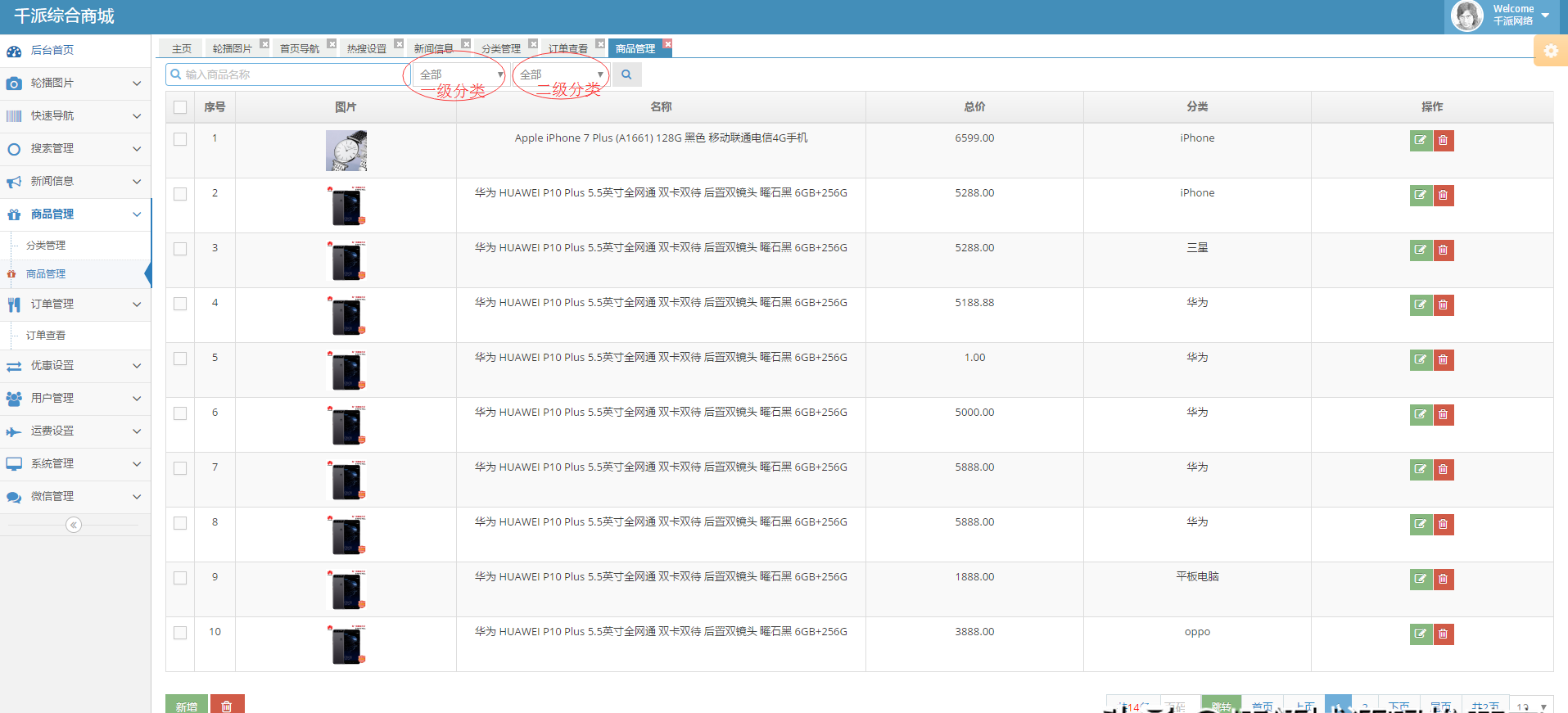 商品分类为二级分类,先添加一级分类(商城中一级分类未展示图片,用户可以根据需要修改分类展示的页面布局),