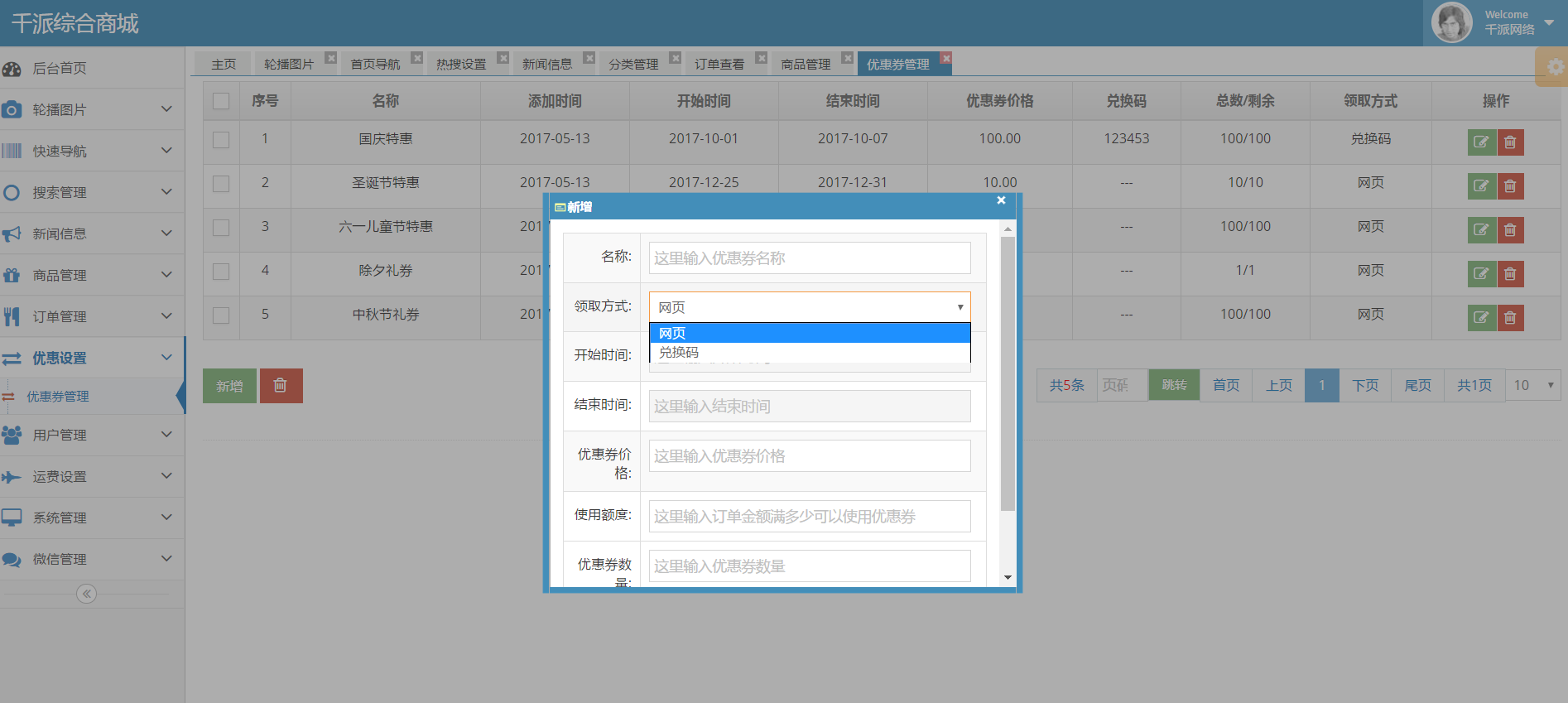 优惠券管理: