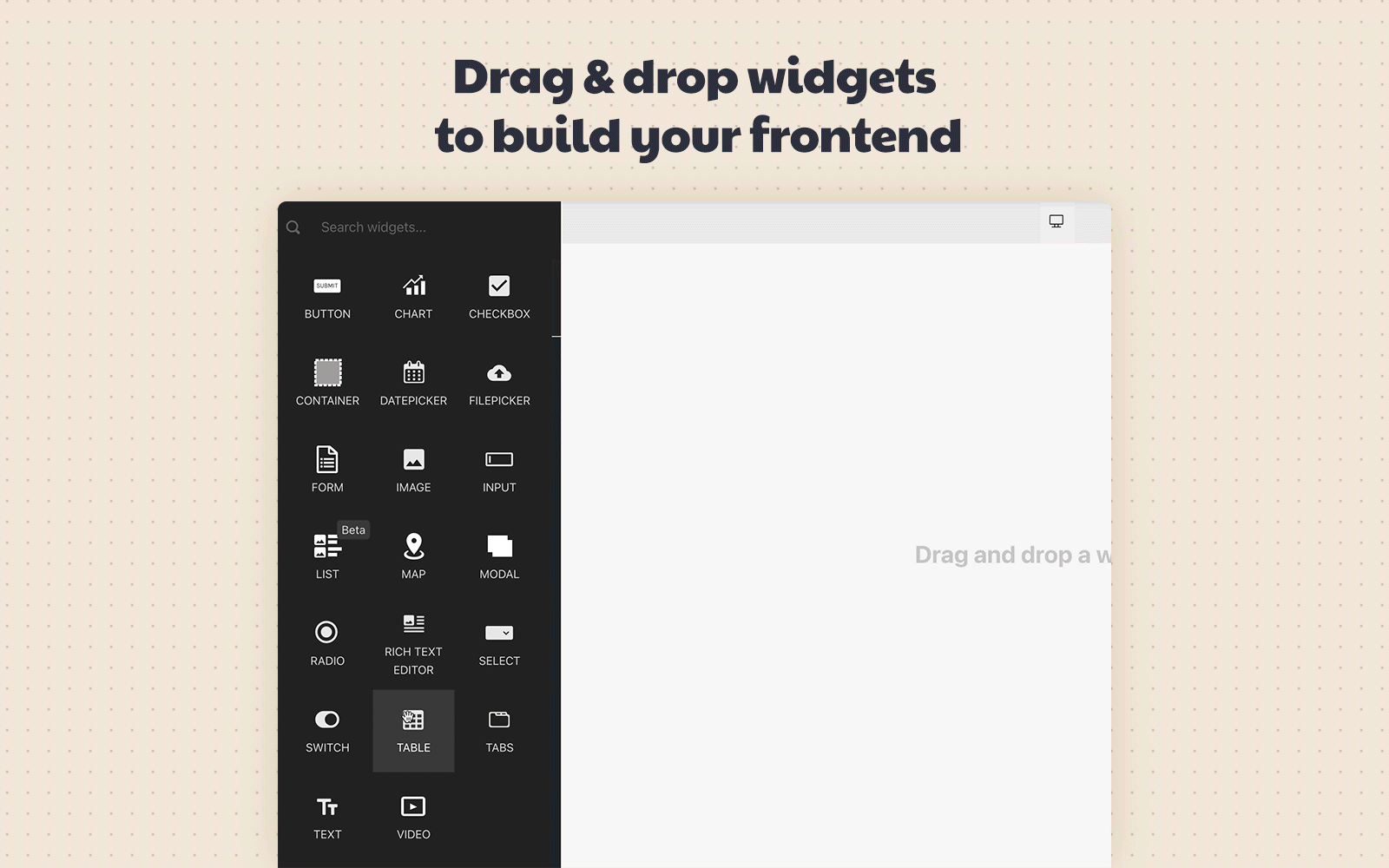 用于构建管理面板、内部工具和仪表板的低代码项目。与 15 多个数据库和任何 API 集成。组件包括文本、表单、输入、按钮、表格、图像、图表、复选框、开关、单选按钮、日期选择器、下拉列表、文件选择器、容器、地图、模式、富文本编辑器、选项卡和视频。