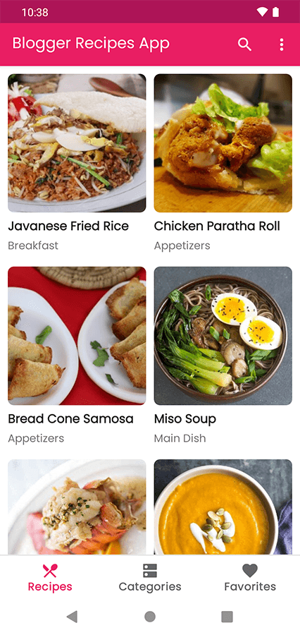 Blogger 食谱应用程序以食谱应用程序模板格式显示来自 Blogger 站点的帖子或内容。它将所有 Blogger 帖子、标签和节目加载到一个漂亮且设计良好的布局中,作为食谱应用程序。在 Android 平台下运行,使用带有 Java 编程语言的 Android Studio 构建,使应用程序原生运行,快速流畅。实施 Google Material Design UI 让应用在设计和用户体验方面更加美观。