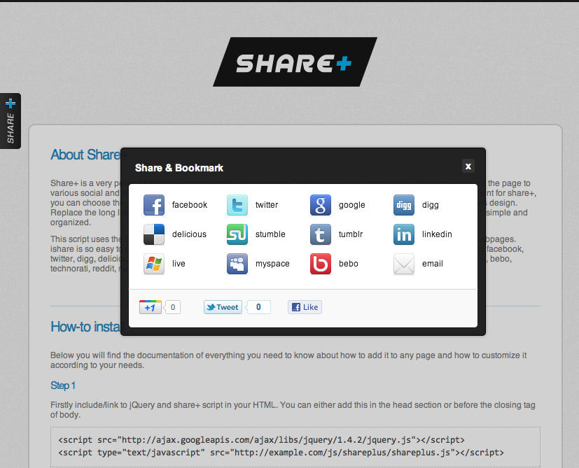 Share+ 使用 jQuery 框架并在客户端工作。因此,您可以在静态和动态网页上使用它。通过包含主题 CSS 样式表、javascript 文件和一行代码,在几秒钟内将其添加到您的站点。 . Share+ 支持所有主要社交网络——包括 facebook、twitter、pinterst、digg、delicious、yahoo、email、fav、print、live、stumbleupon、orkut、tumblr、linkedin、myspace、evernote、bebo、technorati、reddit、newsvine、mixx 、netvibes、google+,您可以添加自己的!