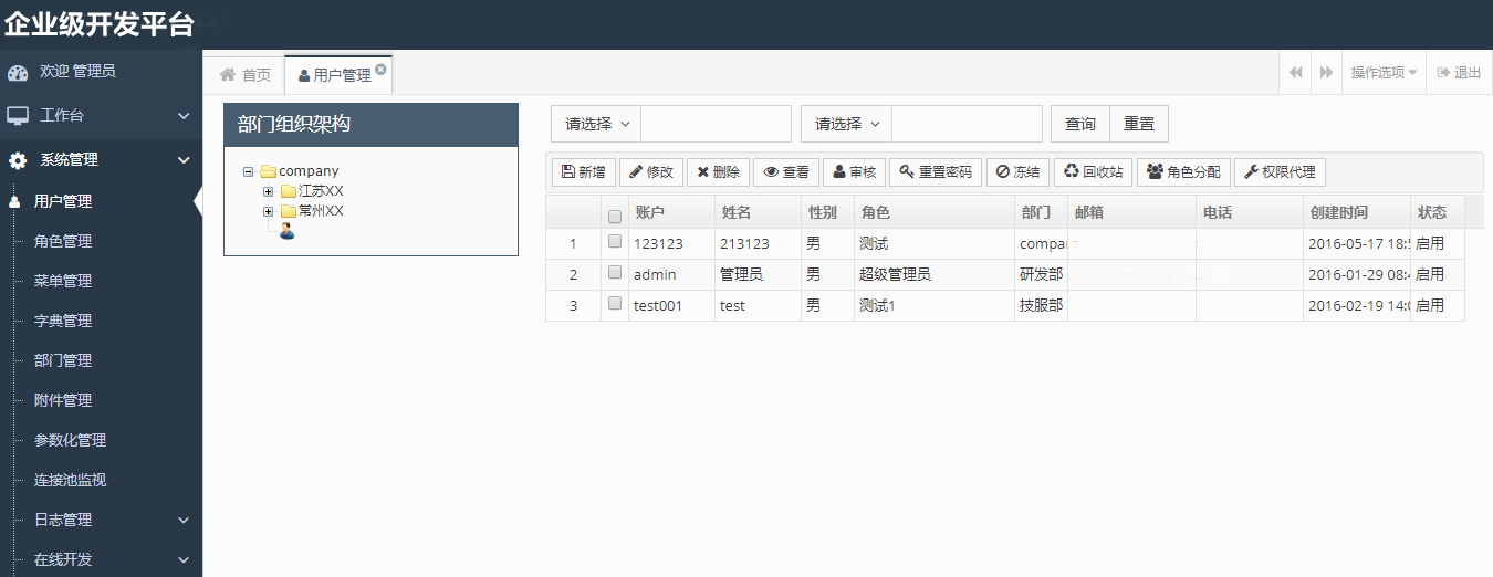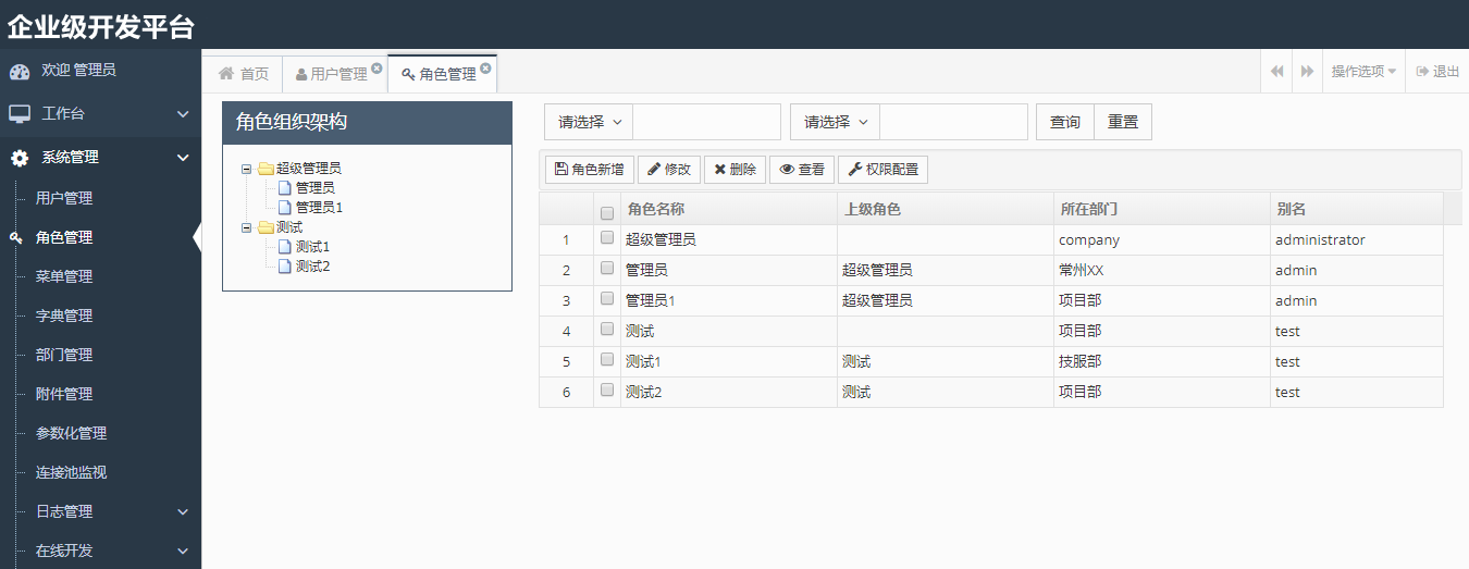 内置功能:用户管理、角色管理、菜单管理、字典管理、部门管理