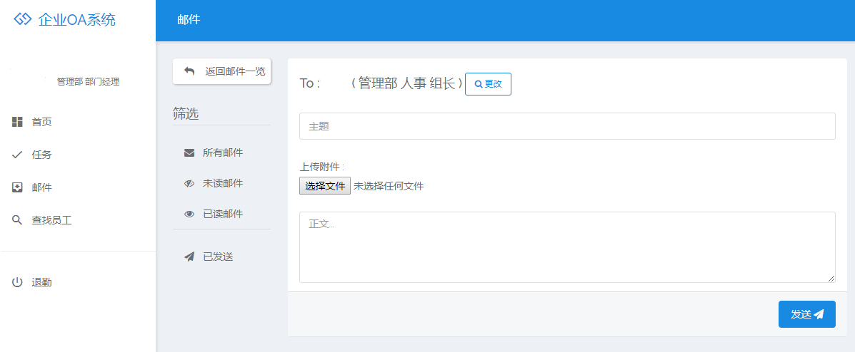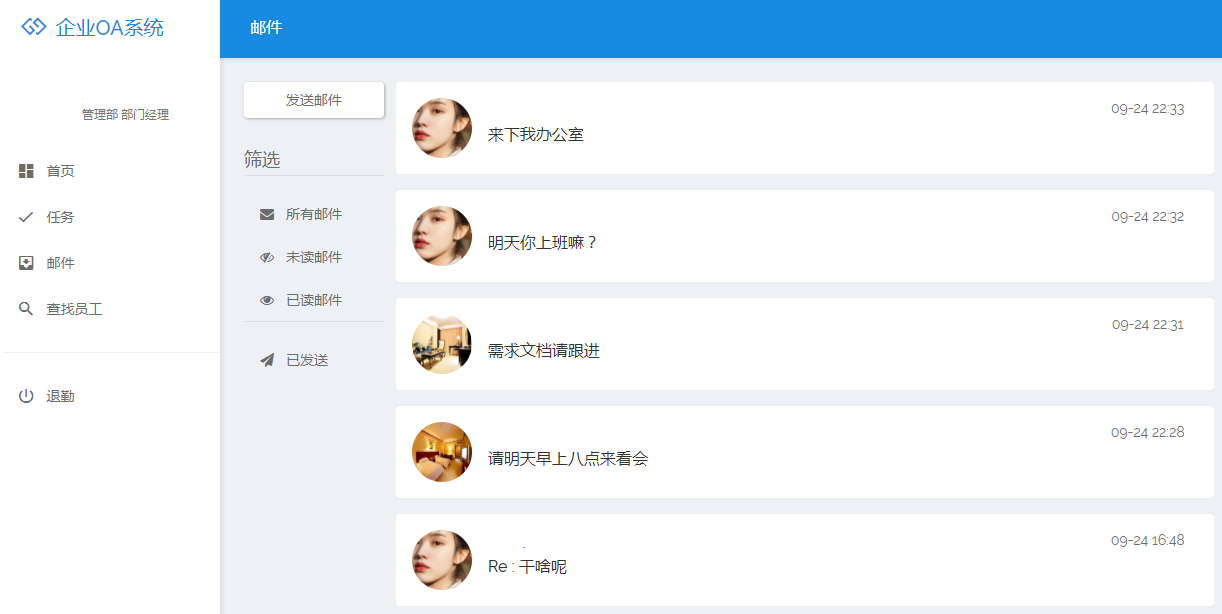 OA办公管理系统,这是一款由jsp+ssm(spring+s pringmvc+mybatis)+mysql实现的简单的OA办公管理系统,轻松办公