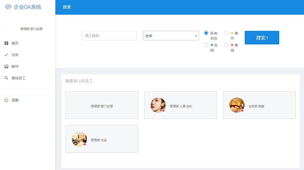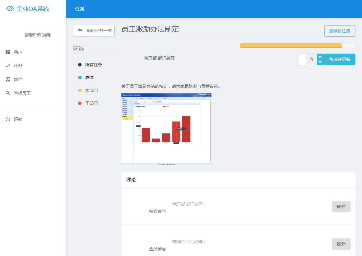 主要实现的功能有员工注册登录,自动计算当前月迟到、早退、加班、缺勤天数并根据图表展示,任务管理(任务发布、更新、删除、进度条展示完成度),