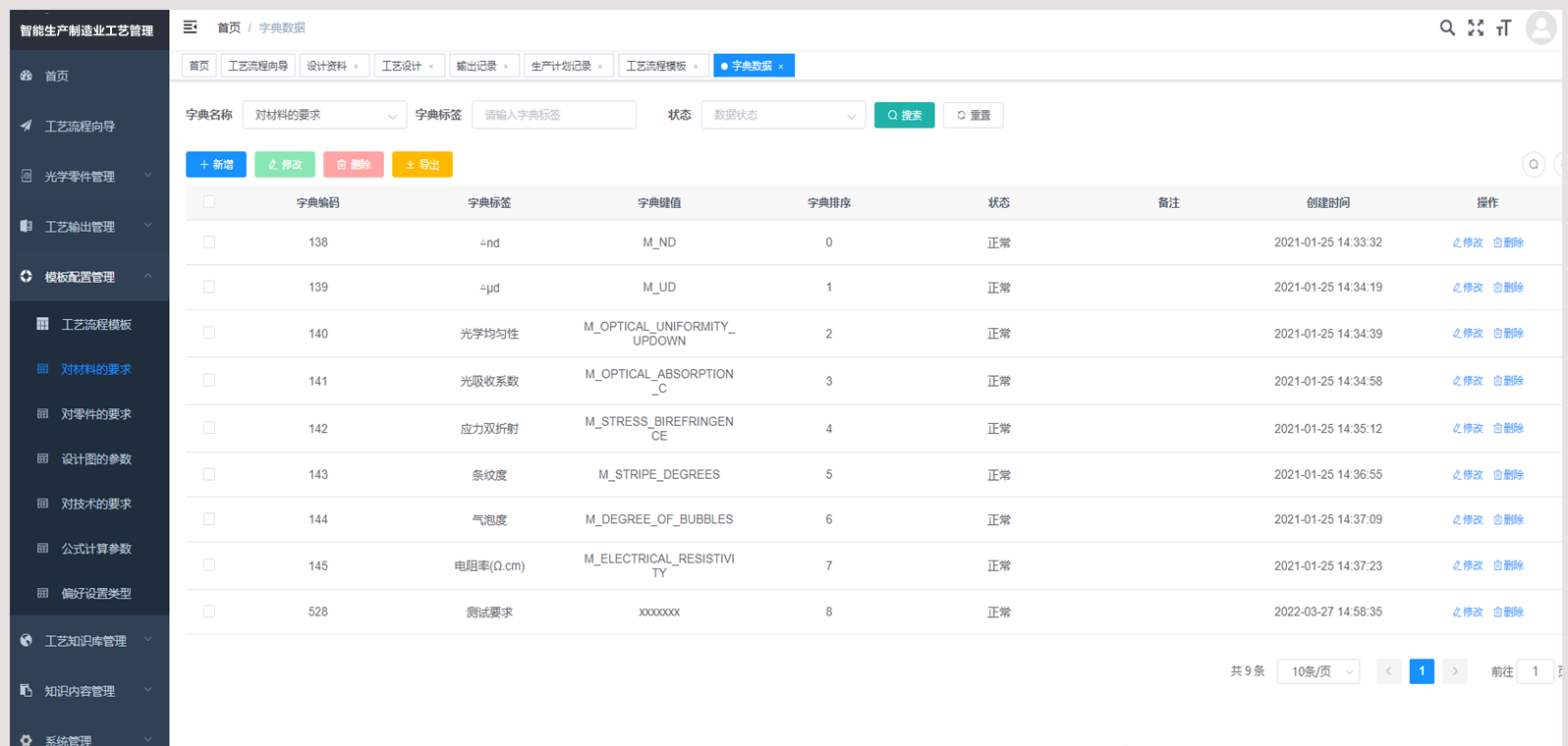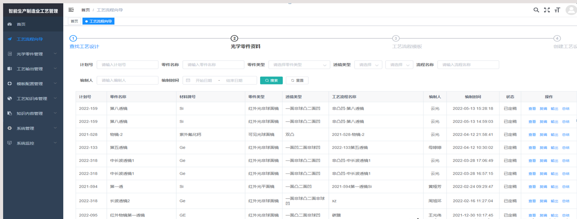 光学零件工艺设计、工艺输出记录、生产计划记录、光学零件模板、工艺流程模板