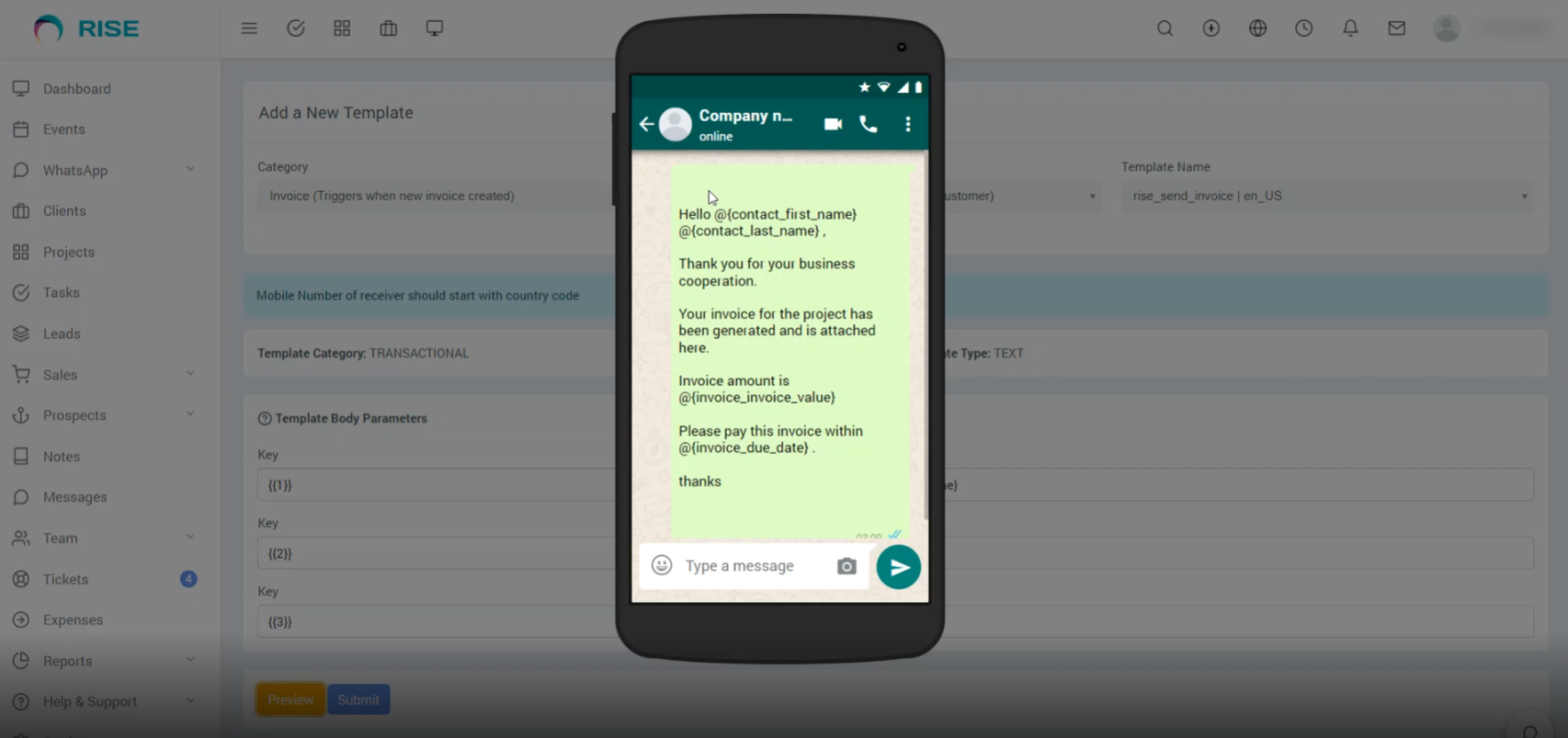 RISE CRM 的 WhatsApp Business Platform 集成插件使大中型企业能够在 WhatsApp Business Account (WABA) 限制下使用云 API 和免费消息传递与客户进行大规模联系。您可以开始与客户对话,发送客户通知或有关 RISE CRM 中发生的操作的信息(发票生成、提案等 – 请查看下面的完整操作列表)。