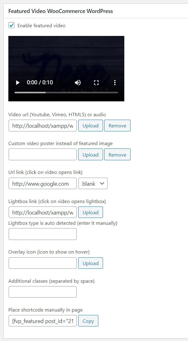 可以选择设置自定义图像而不是特色/产品图像,设置视频 url 链接,设置可以在弹出窗口中单击打开的灯箱 url(图像、视频、自定义 iframe)