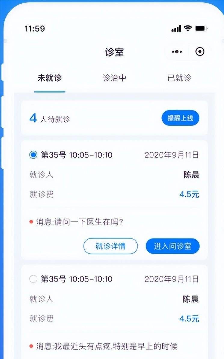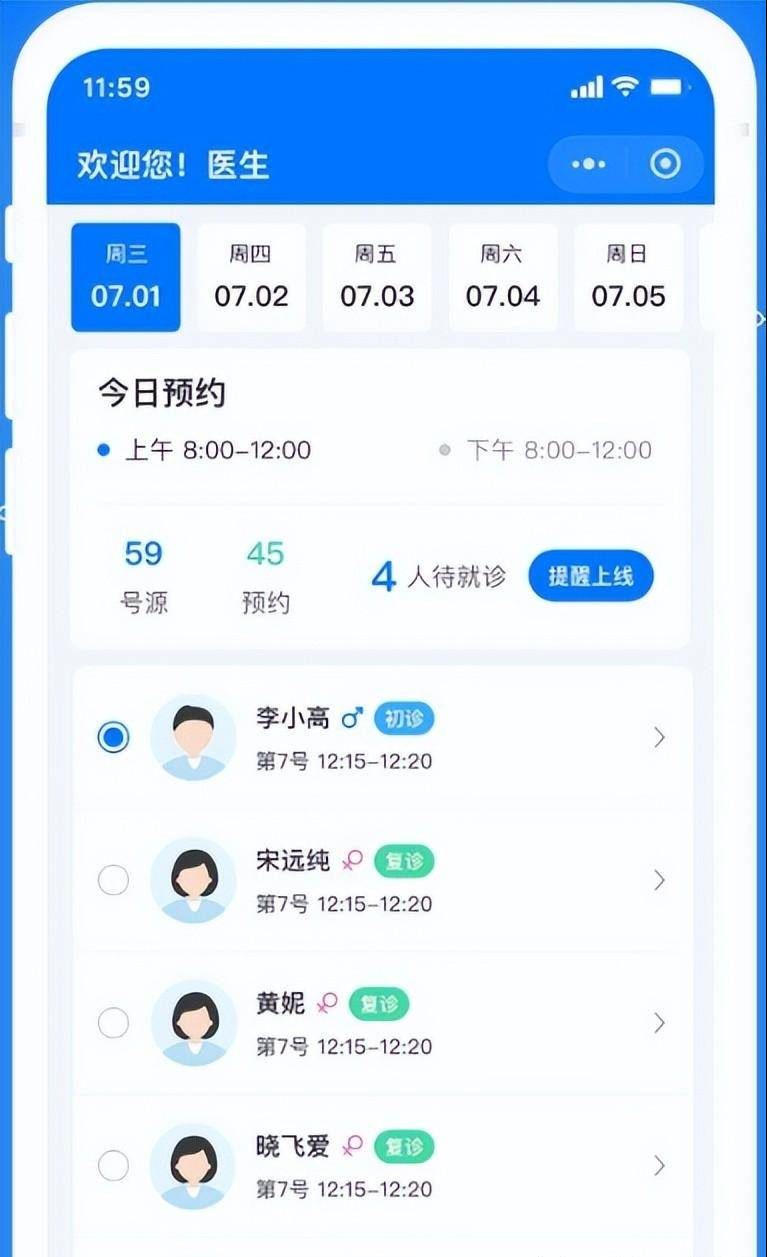 根据后台的出诊诊室,在患者小程序端进行展示,显示当前医生的出诊状态。(出诊状态包括即将出诊、正在出诊、已下线、已满诊)