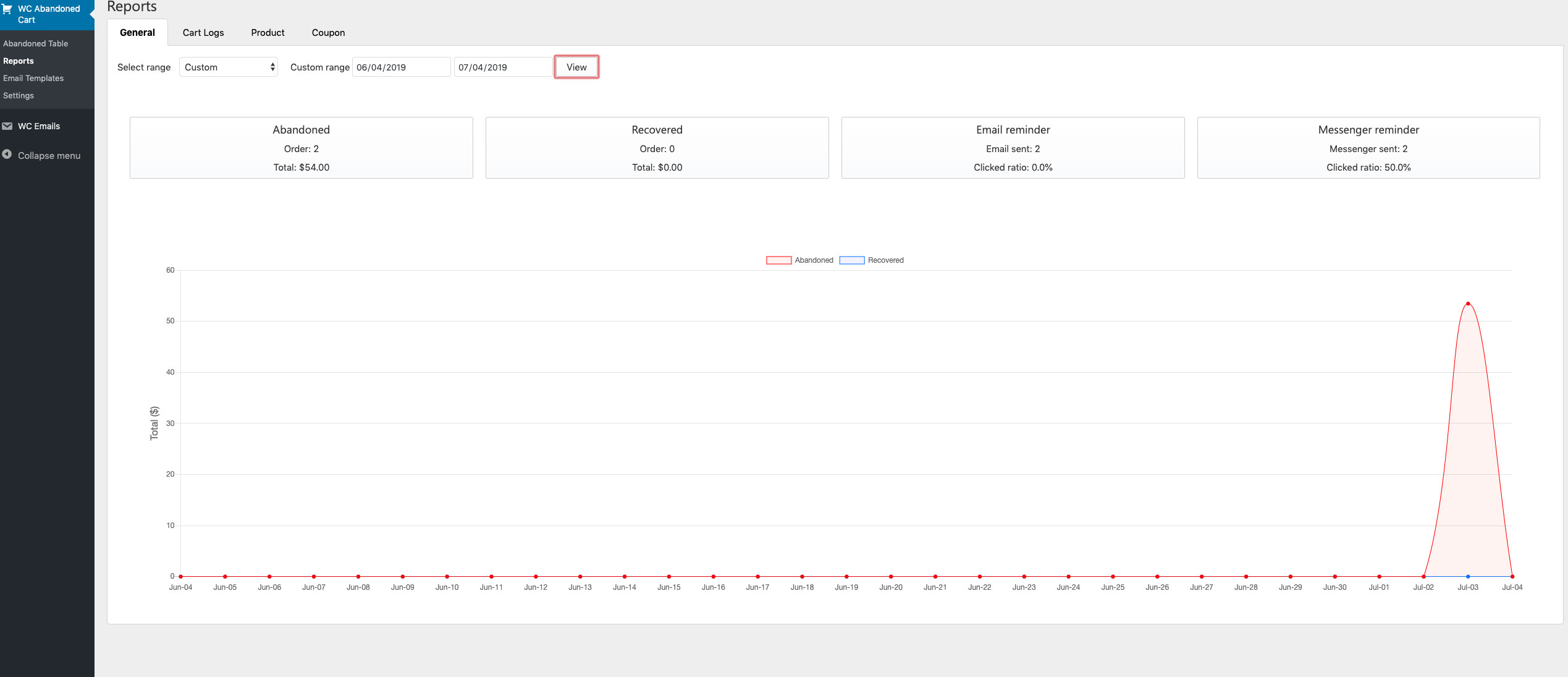 该插件提供了 4 种类型的报告供您检查废弃的购物车。选择合适的报告类型和时间范围,查看该时间的废弃购物车的报告。