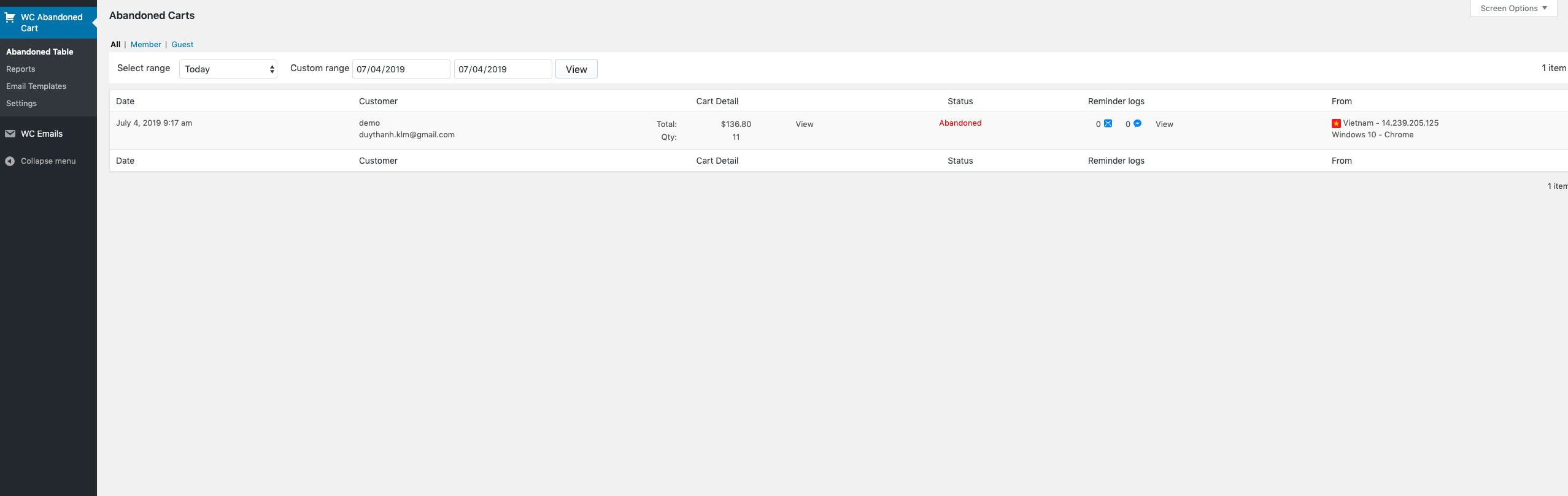 废弃表:废弃的购物车将保存在插件后端。并且您可以随时查看记录。这些记录提供有关时间、用户名、电子邮件、商品数量、购物车总价、商品列表、状态、提醒日志、客户 IP 和国家/地区的信息。