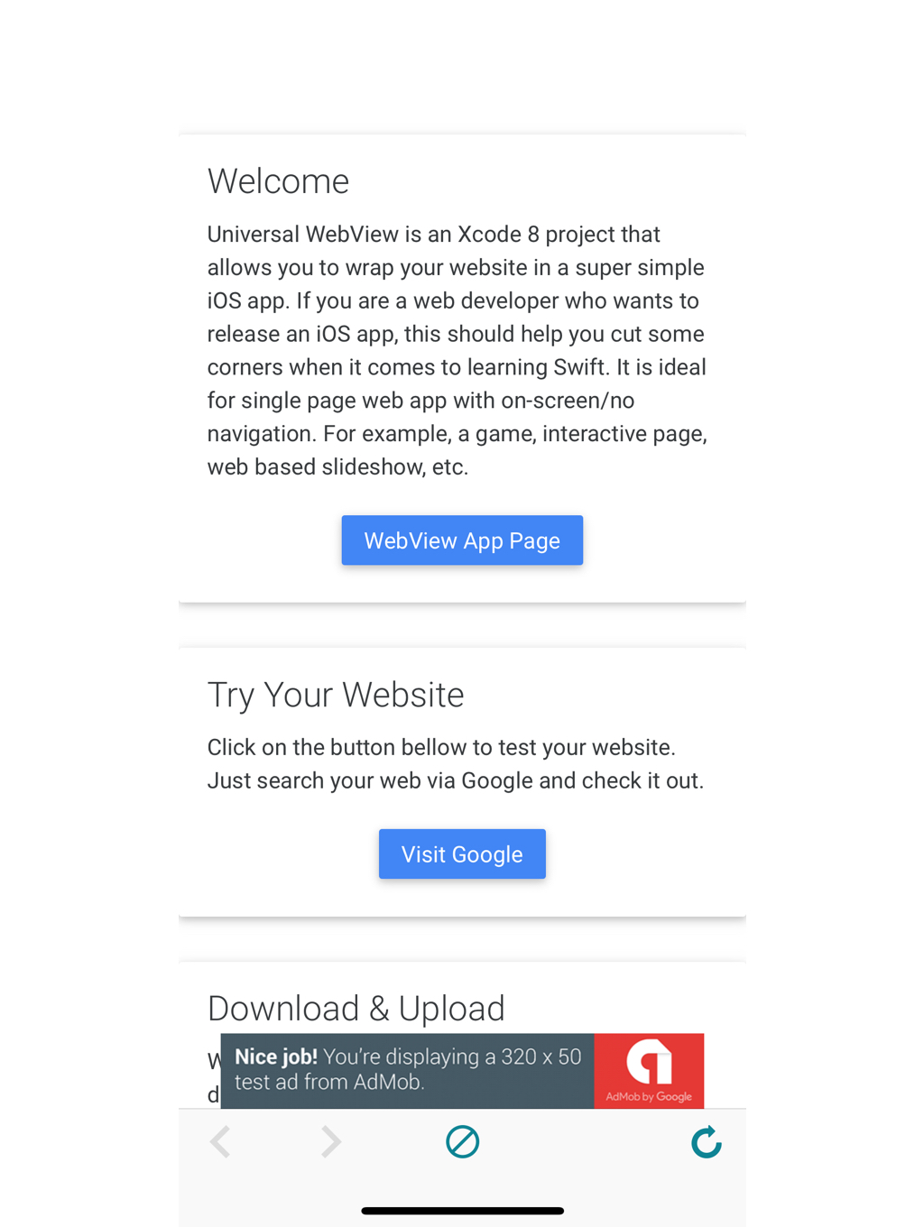 工具栏——我们创建了一个不错的工具栏,其中包含几个您的客户可以使用的按钮。我们实施了后退、前进和刷新按钮来处理您的网站。如果您的应用有广告,还有一个用于删除广告的按钮。不用担心,如果您的应用没有应用内购买,则该按钮是不可见的。此外,如果您不需要工具栏,只需在我们创建的配置文件中将“工具栏”设置为“否”即可轻松设置应用程序。