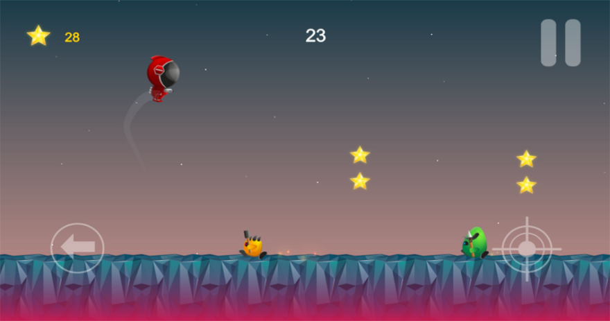游戏中有一个可爱的跳线男子,他使用喷气背包在屏幕上跳跃,收集皮卡并避开紫色尖刺外星人。