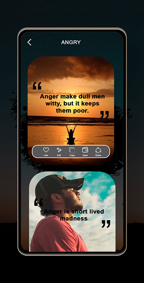 您还可以更改报价的背景。这个应用程序有一些适合您报价的出色背景。您还可以从图库中添加自己的背景。我们还为不同类型的报价添加了许多新的类别背景,例如商业、圣诞节、新年快乐、创意写作、爱情报价、自然和一些杂项背景。我们还为简单的引号添加了一些简单的背景,并添加了一些具有不同图案纹理的背景。