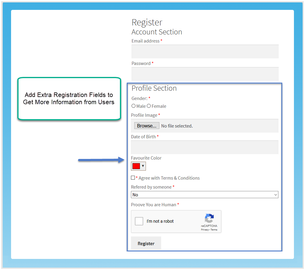您可以使用 WooCommerce 注册插件创建任意数量的自定义字段,为您的客户构建独特的表单。您可以添加文本区域、文本框、选择框、复选框、多选框、单选按钮、时间选择器、日期选择器、密码、文件上传、颜色选择器和数字字段。