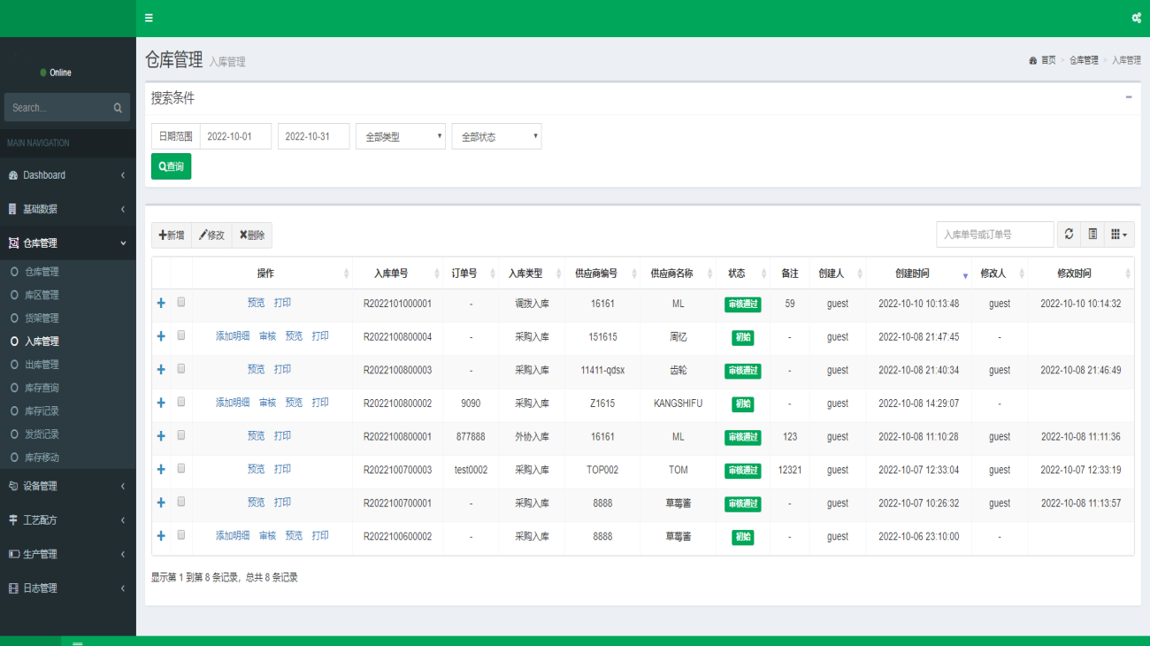仓库管理:仓库管理,库区管理,货架管理,入库管理,出库管理,库存管理,调拨管理,盘点管理
