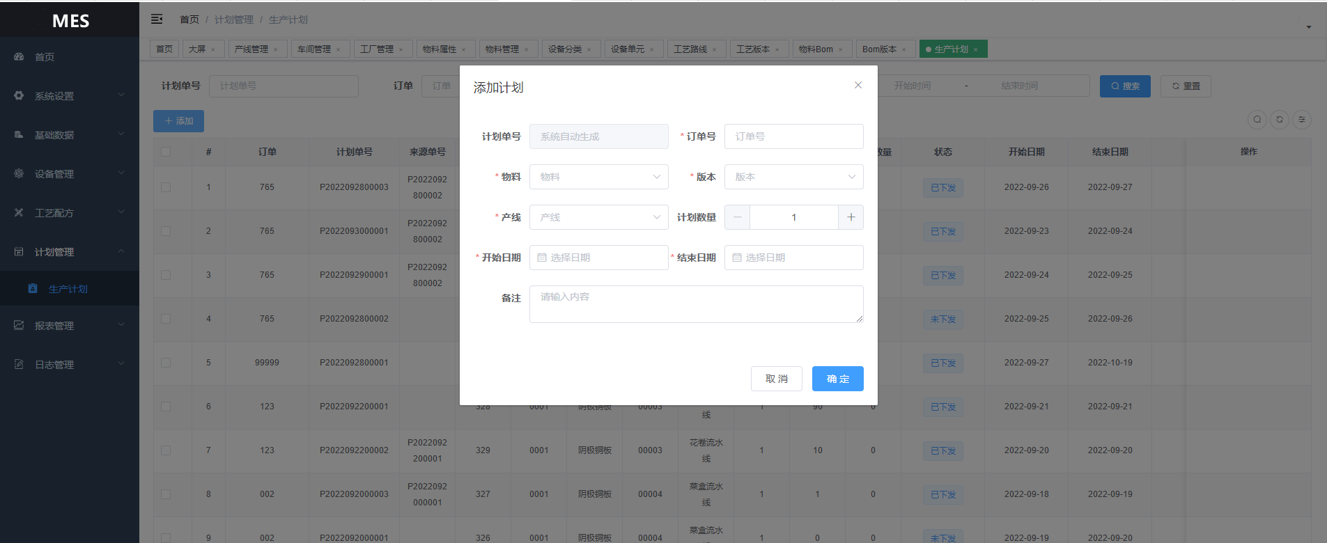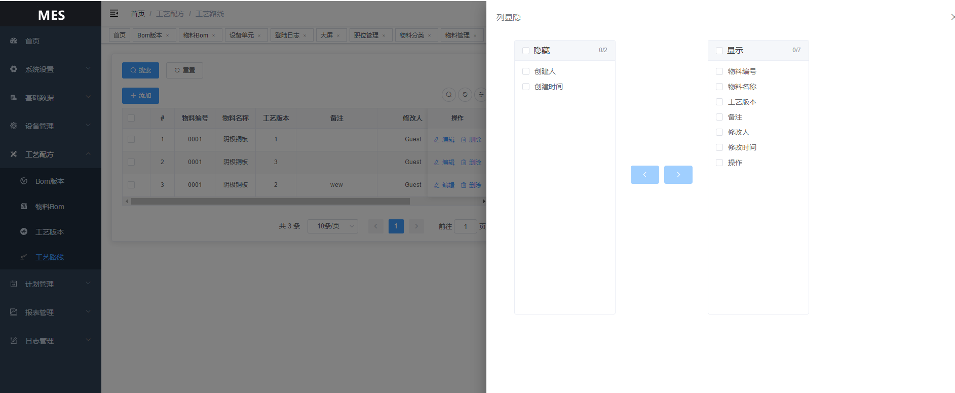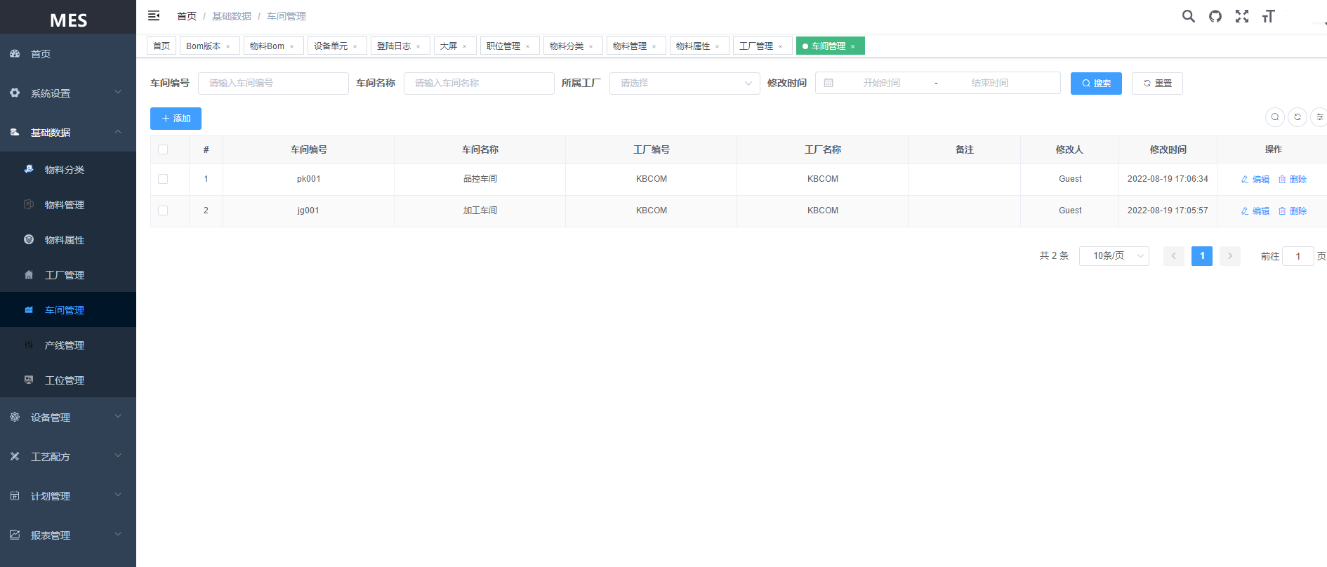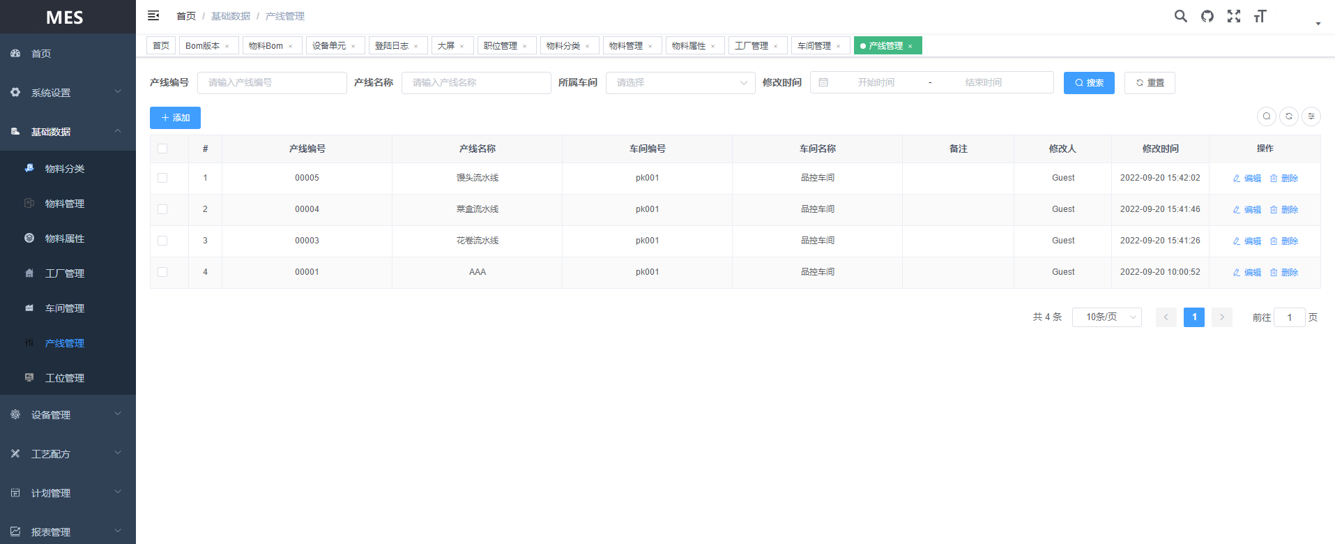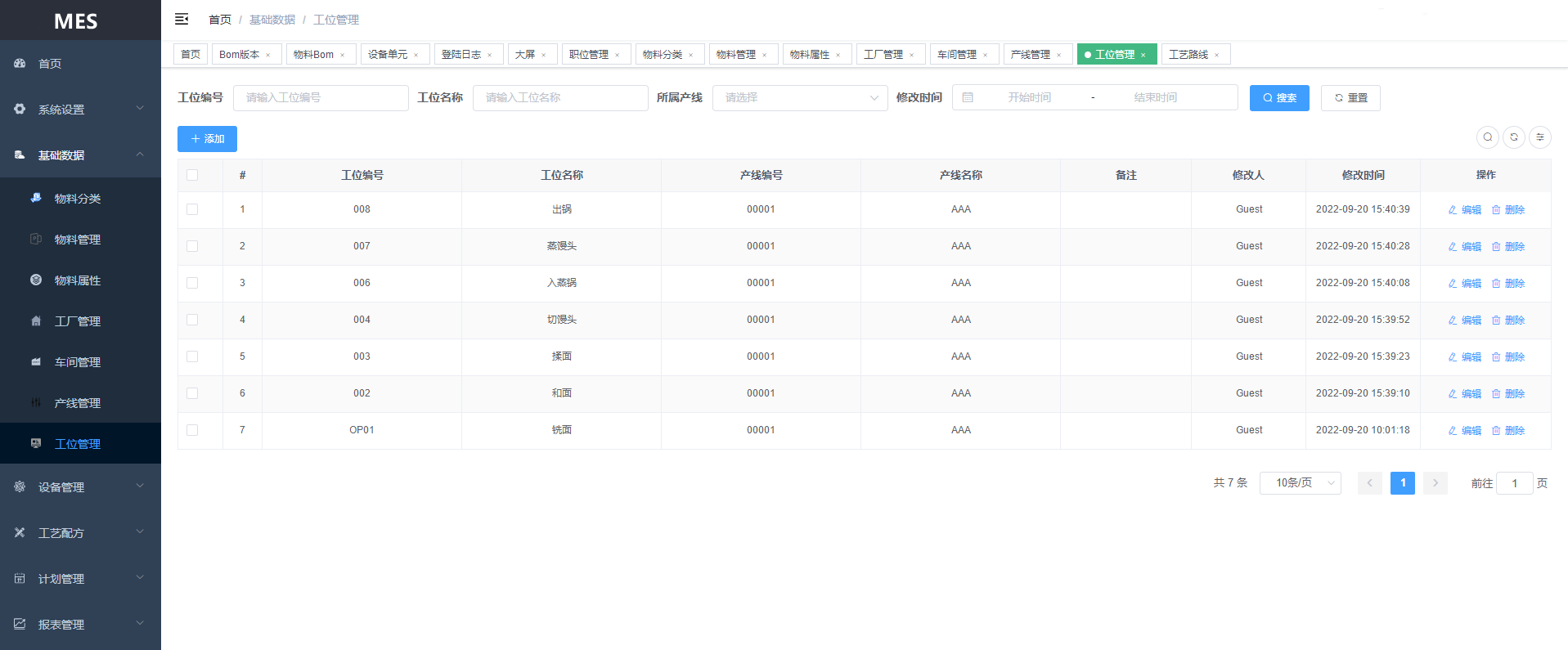 基础数据:物料分类、物料管理、物料属性、工厂管理、车间管理、产线管理、工位管理